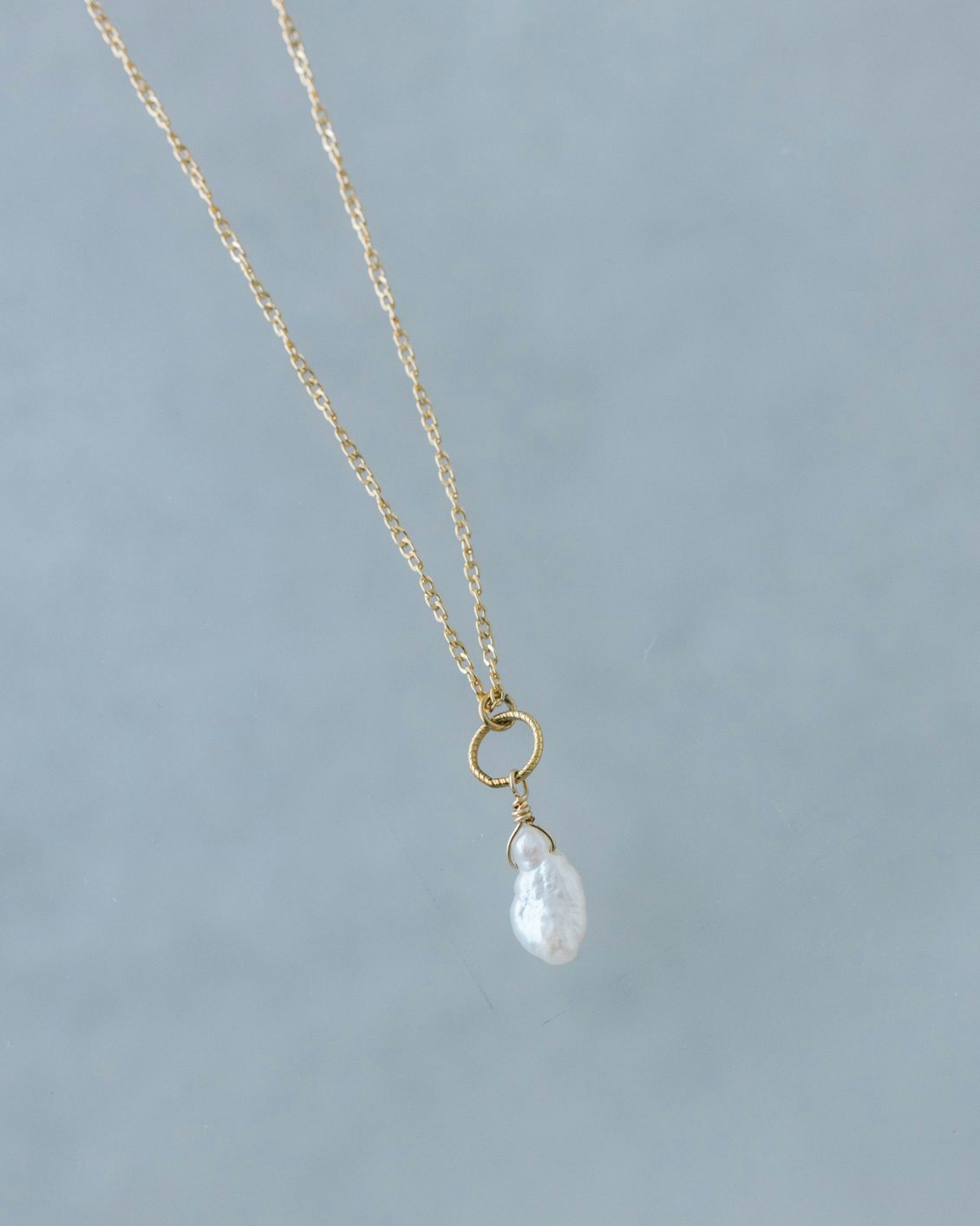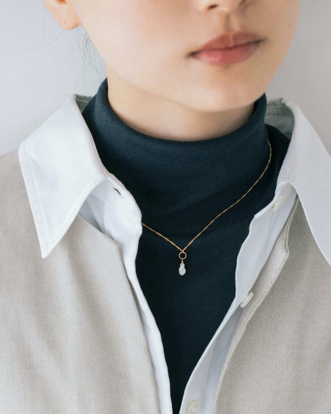 こちらは一粒の小ぶりなケシパールが印象的な、ペンダントタイプのネックレス。