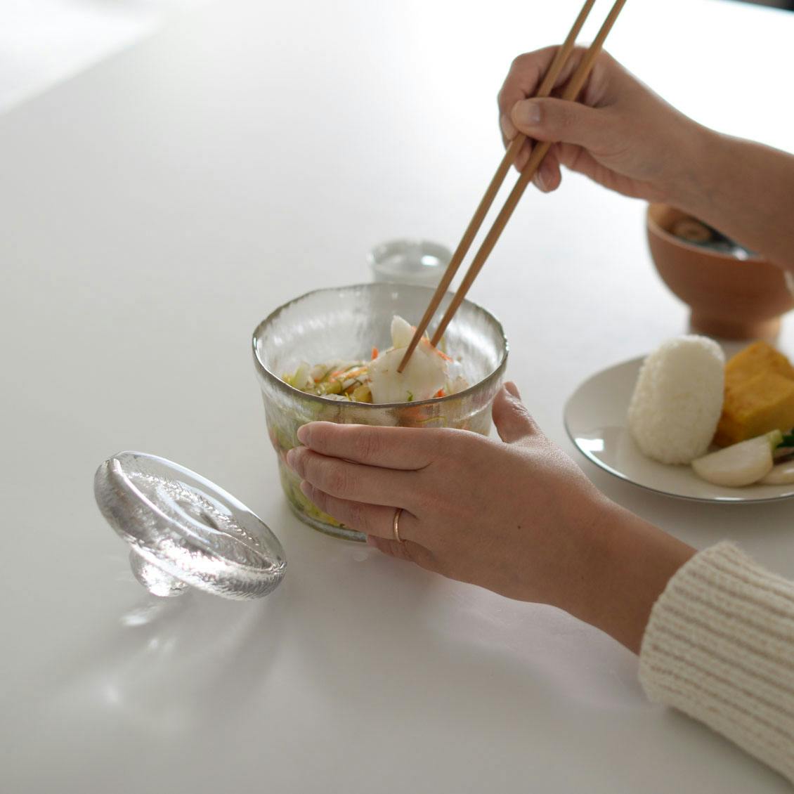 | 注意事項 | ※密封ではないので、ニオイが気になる方はラップをかけることをお勧めします。 ※食器洗浄・乾燥機をご使用の際は、使用状況により傷や破損の原因になります。すすぎが不十分ですと洗剤のアルカリ成分がガラスを曇らせることがございますのでご注意ください。 ※洗浄の際はクレンザーやたわしを使用しないでください。 ※まれに重しが器にはまり、取れなくなってしまうことがございます。もし重しが取れなくなった場合は、熱いお湯をかける・洗剤ですべらすなどをお試しください。破損には十分にご注意ください。 ※ヒビ・カケ・傷のついた製品は思わぬ時に破損し、ケガをするおそれがございますので使用しないでください。 ※ガラス製品のためお取り扱いには十分ご注意ください。特に重石にはずっしりとした重みがあるため、器本体に強くぶつけないようやさしく丁寧にお取り扱いいただくようお願いいたします。 ※お使いのPCモニター、スマートフォンの機種によって、実際の色味と若干異なる場合がございます。予めご了承ください。 |