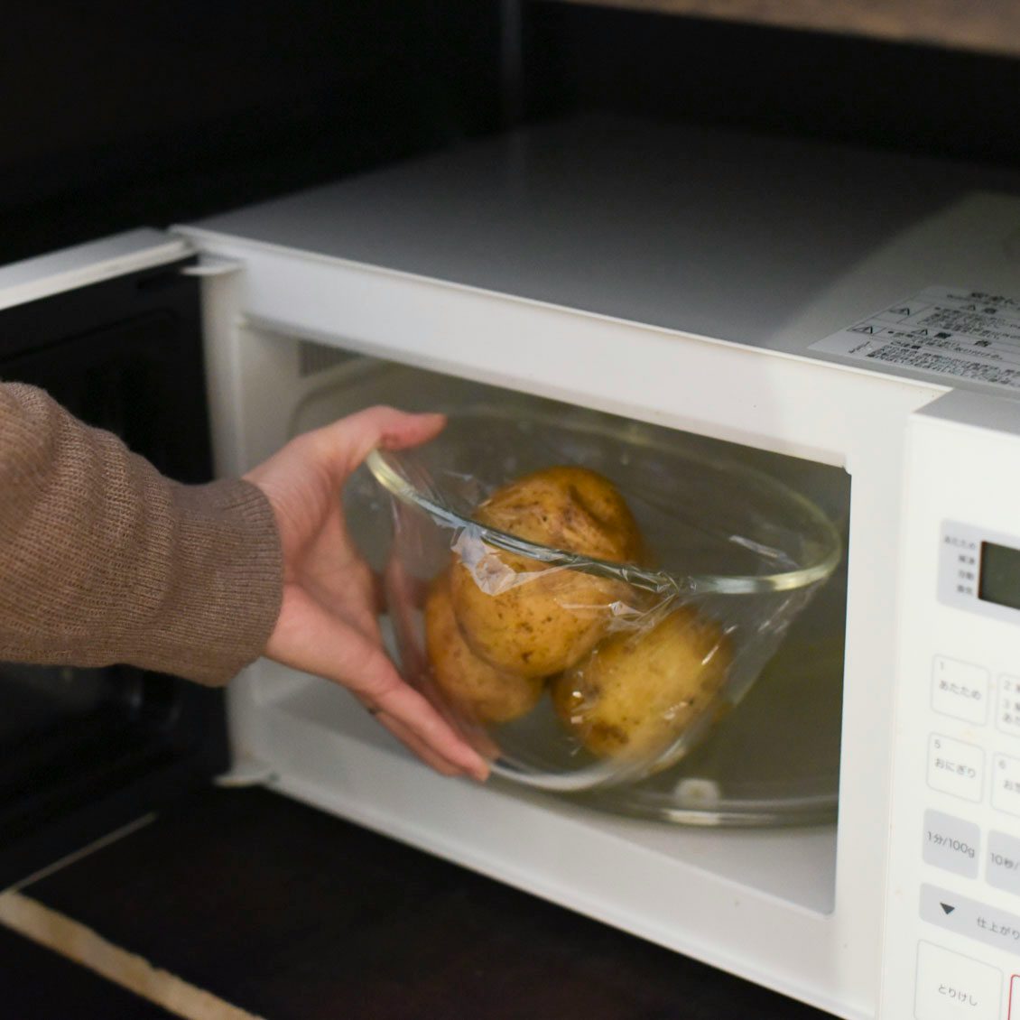 耐熱ガラス製で、このままレンジにかけられるのが嬉しいところ。たとえばポテトサラダを作るとき、じゃがいもをチンしてこのまま潰し、マヨネーズと具材を和えれば完成。と、すべての調理がワンボウルで完結するんです。