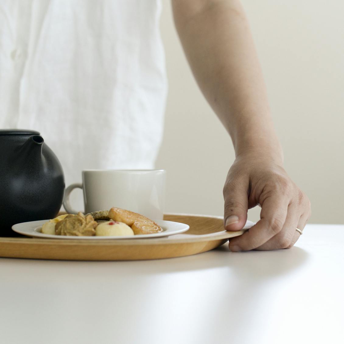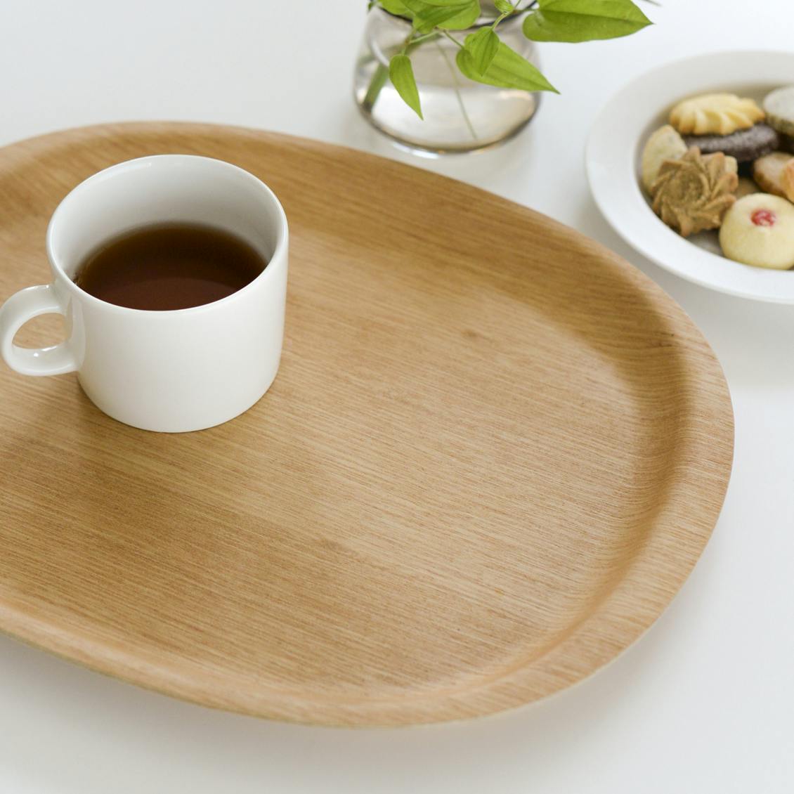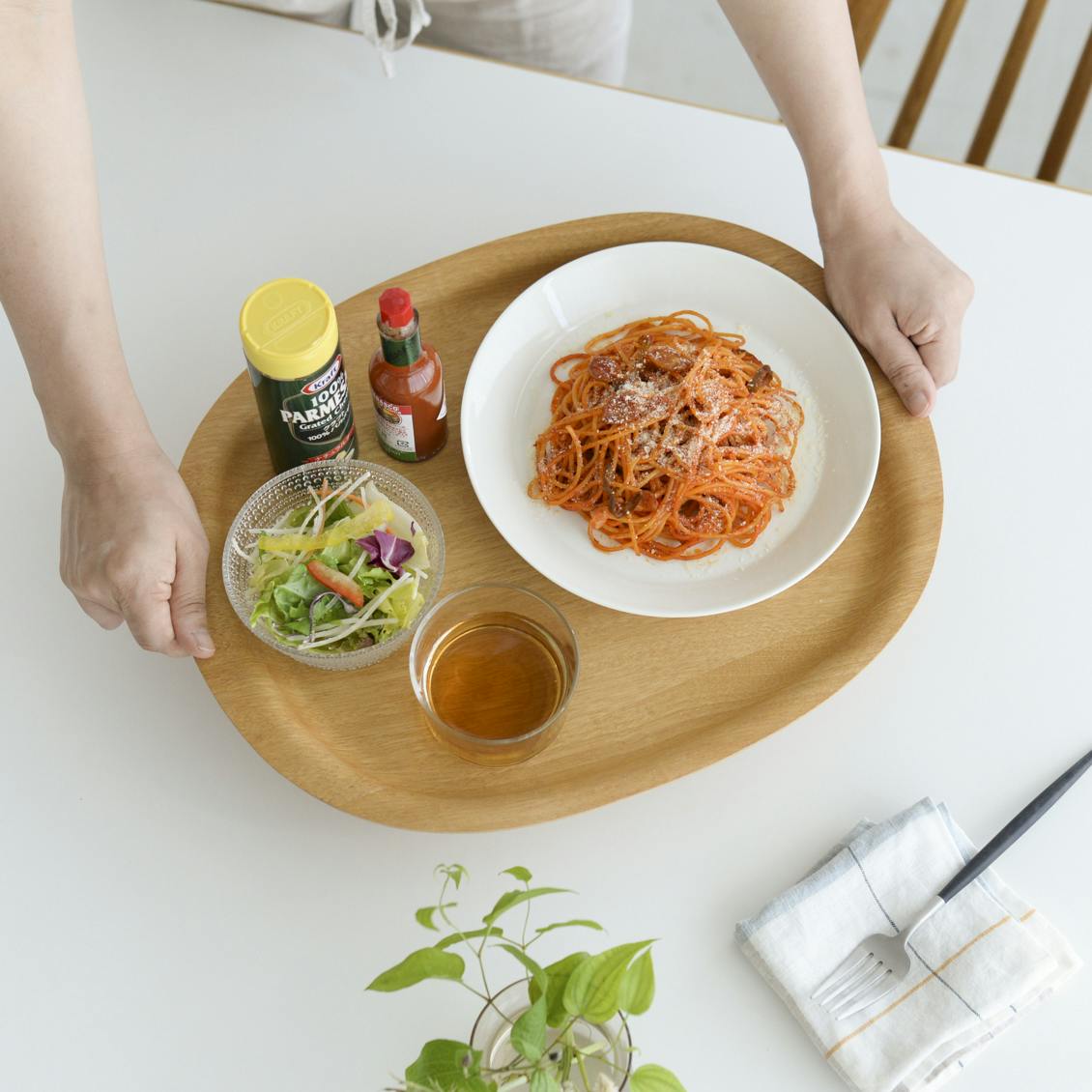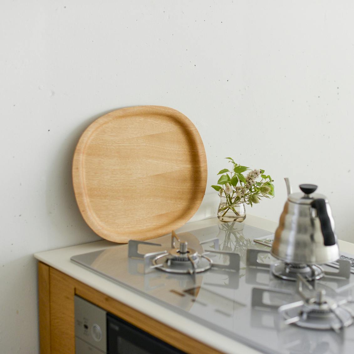 すぐ手に取れるようキッチンに立てかけたり、よく使うものをまとめて乗せたり、トレイは見える場所に出しておくことも多いアイテム。