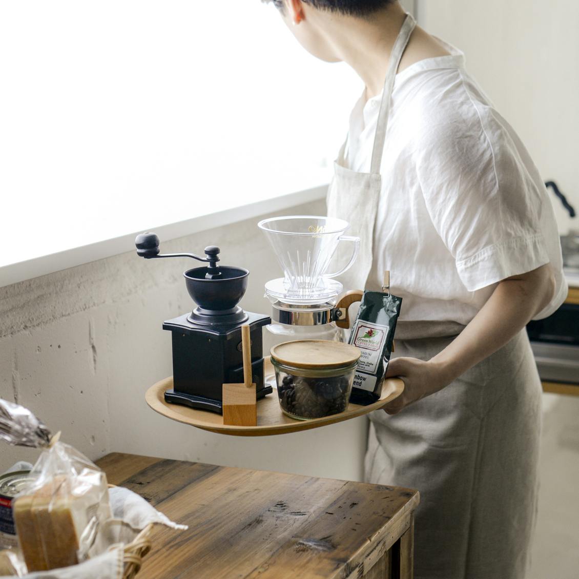 コーヒー道具や朝食セットをひとまとめにしておけば、必要なときにさっと運べて便利ですよ。
