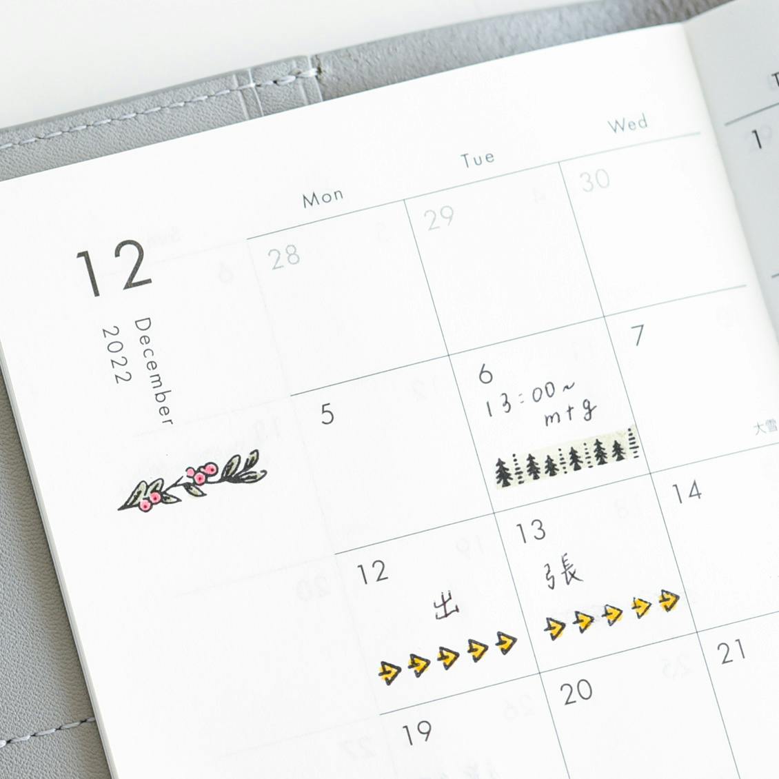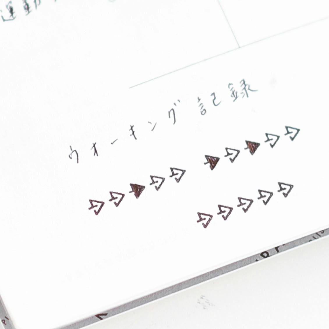 予定の流れを見えやすくしてくれる小さな矢印。縦に押すと小さな木が並んでいるようにも見えるんです。続けたい習慣の記録にもおすすめです。