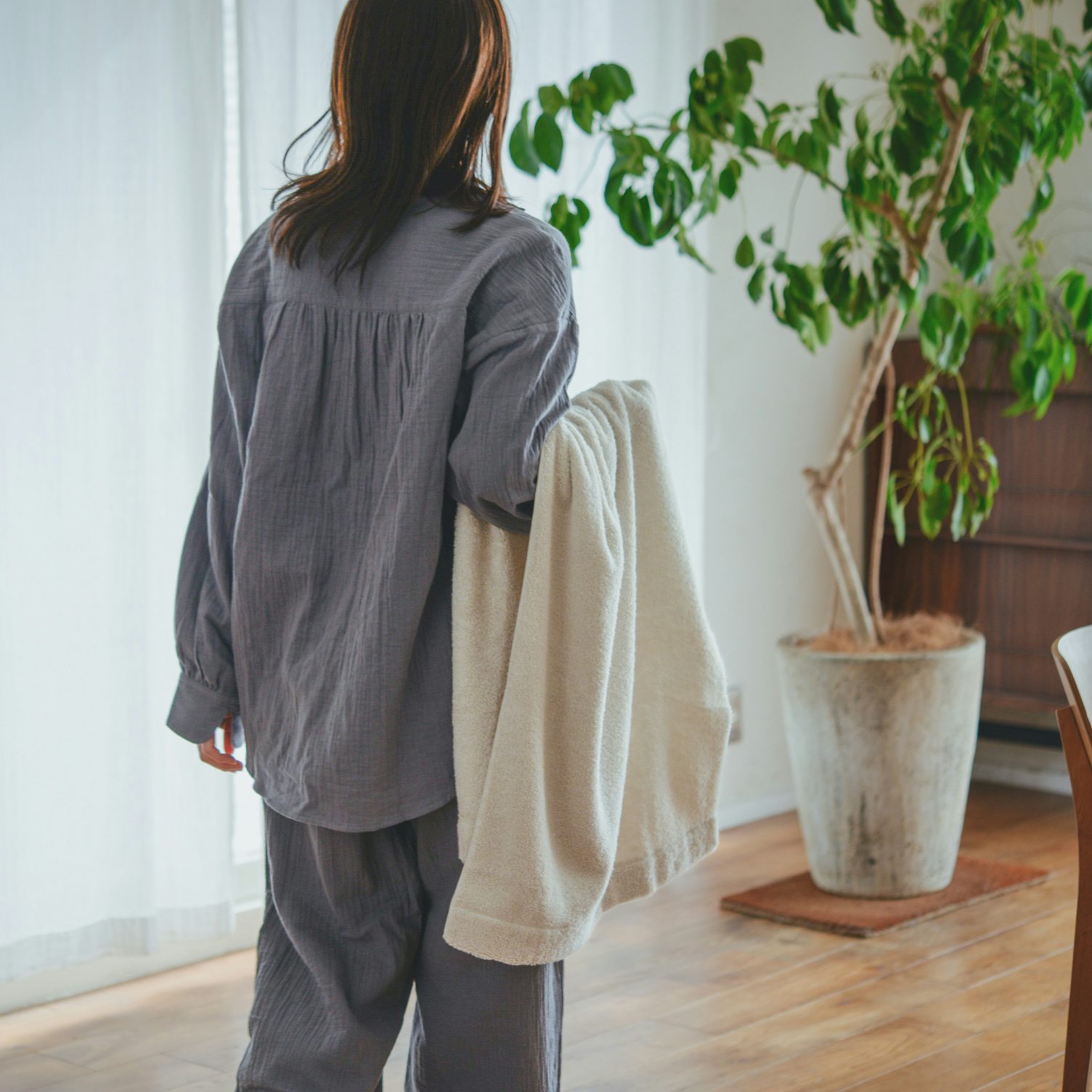 ガーゼ織とパイル織を組み合わせることでボリュームを抑え、仕立て糸にリネンを混ぜてさらりとした使い心地に仕上げました。