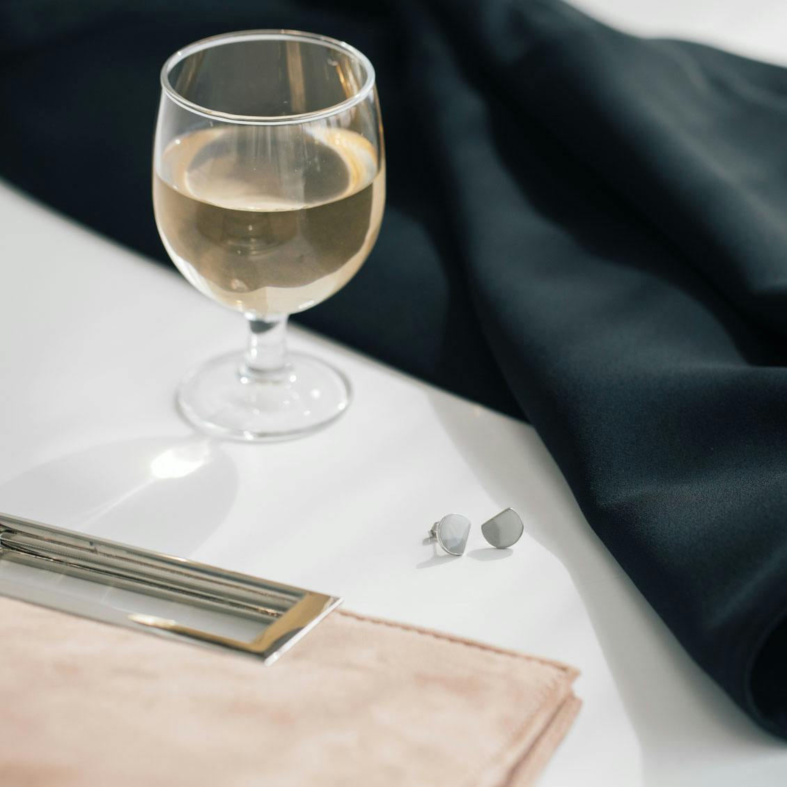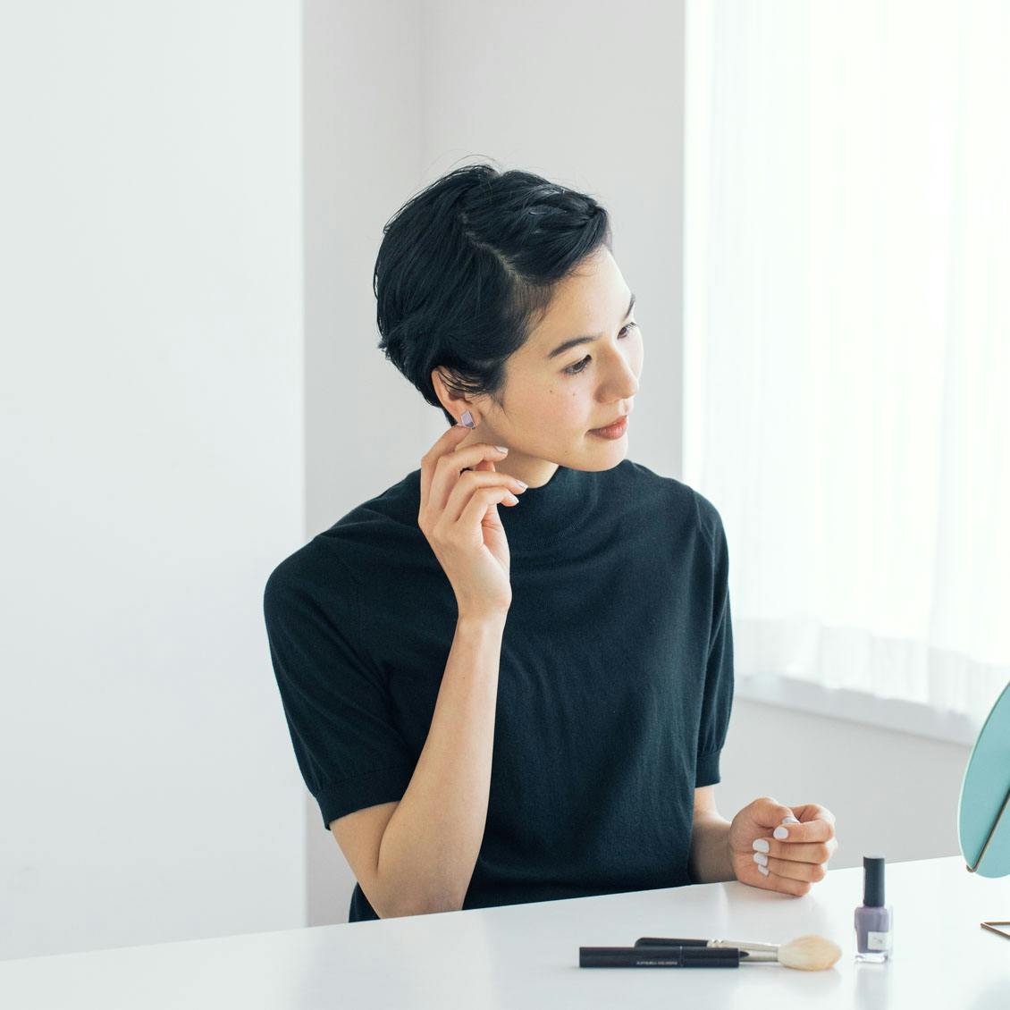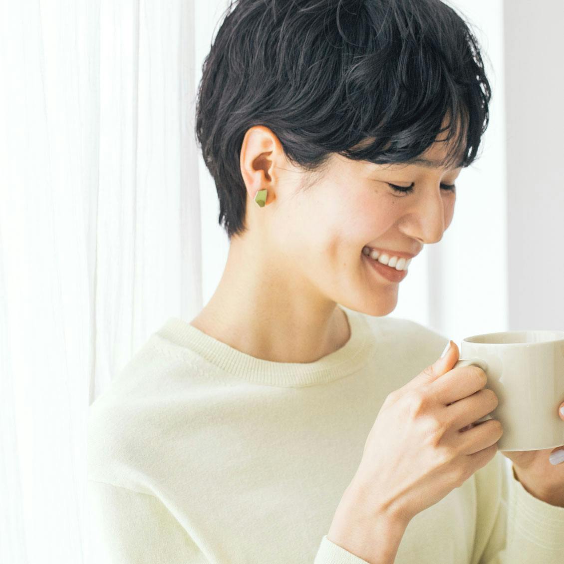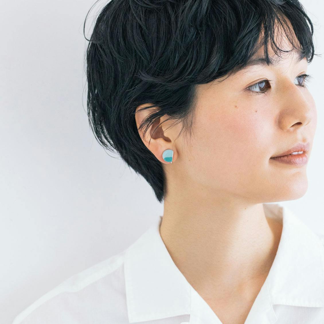 ベーシックな白シャツとのコーデも素敵。耳元に合わせるだけで、装いがスッキリと爽やかに映えるカラーです。