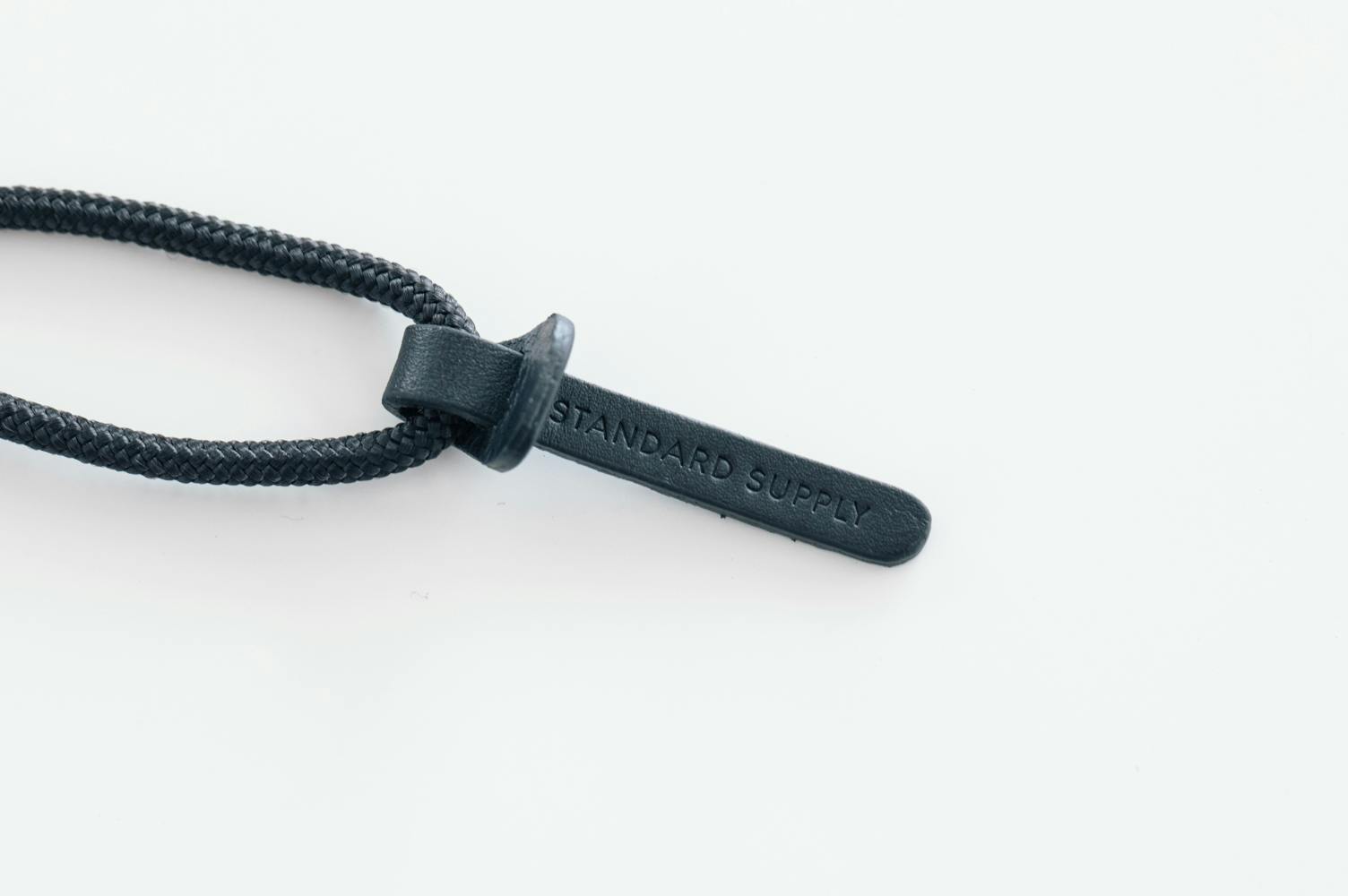 首ひもに小さな革のタグがあしらわれているので、長さが余った部分も素敵に見せてくれます。