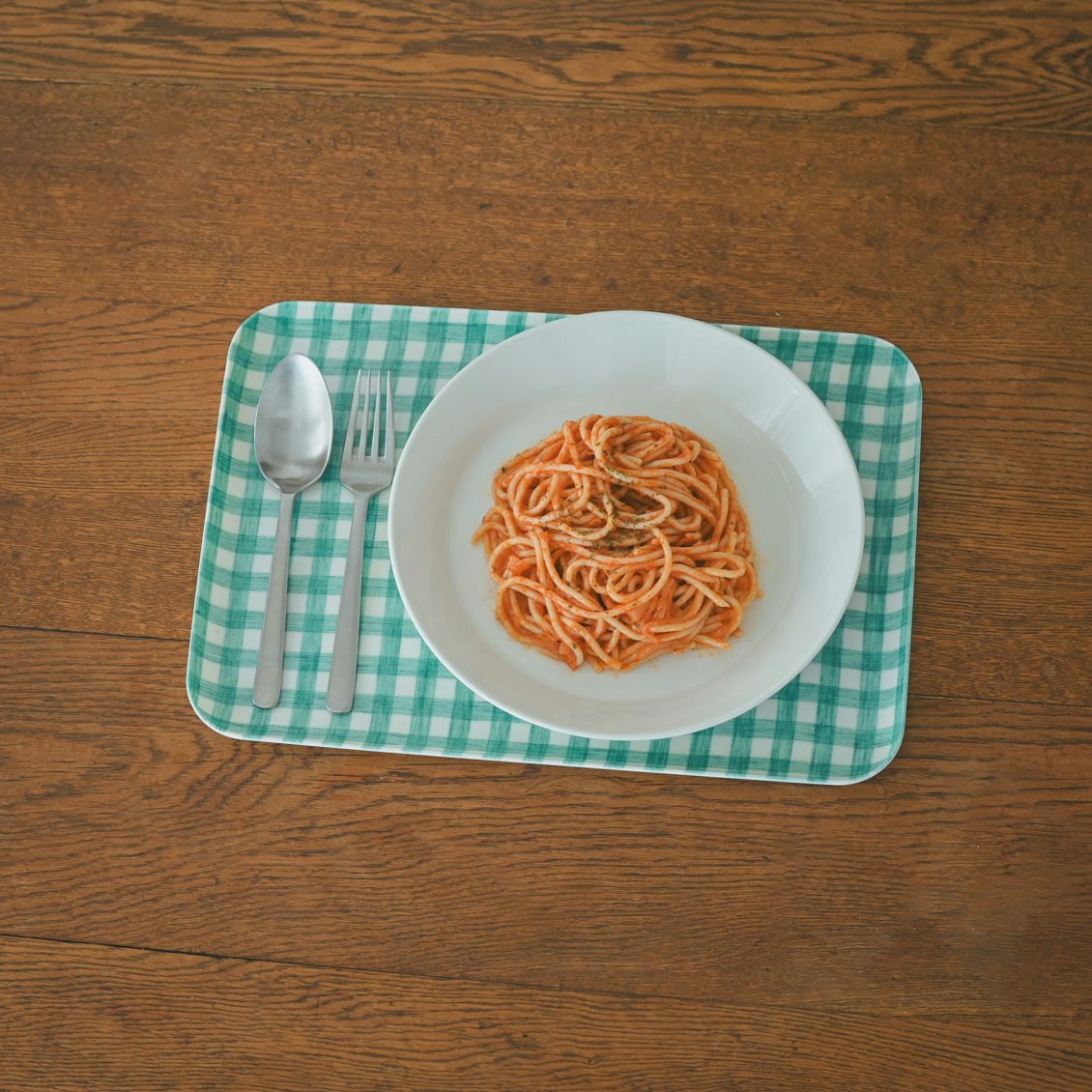 どこかレトロさを感じる、緑のギンガムチェック。ナポリタンをのせた姿は、まるで喫茶店のランチみたいで心が弾みます。