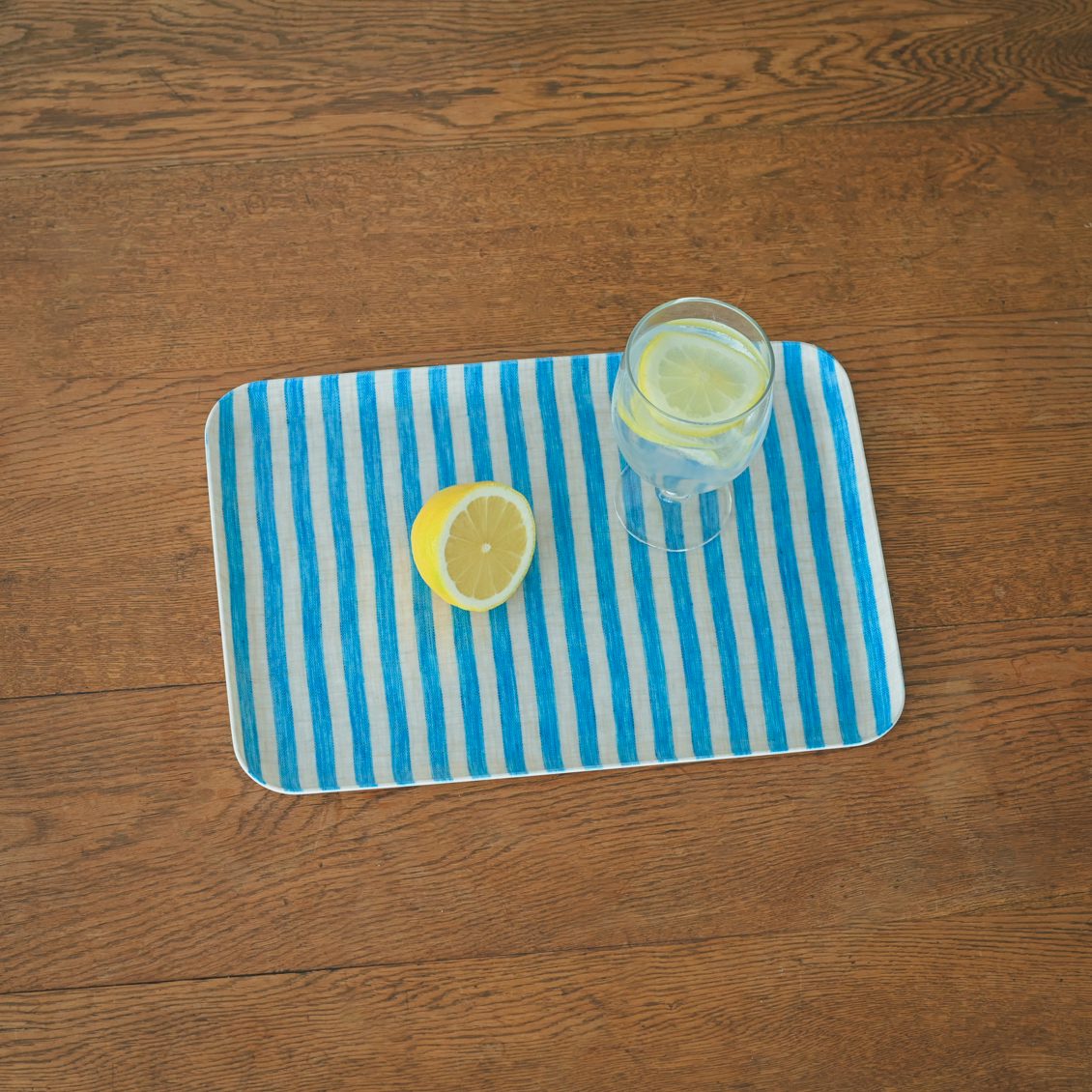 冷たいドリンクが映える水色のストライプ。鮮やかなブルーとうすいベージュの、絶妙な色の取り合わせが素敵です。