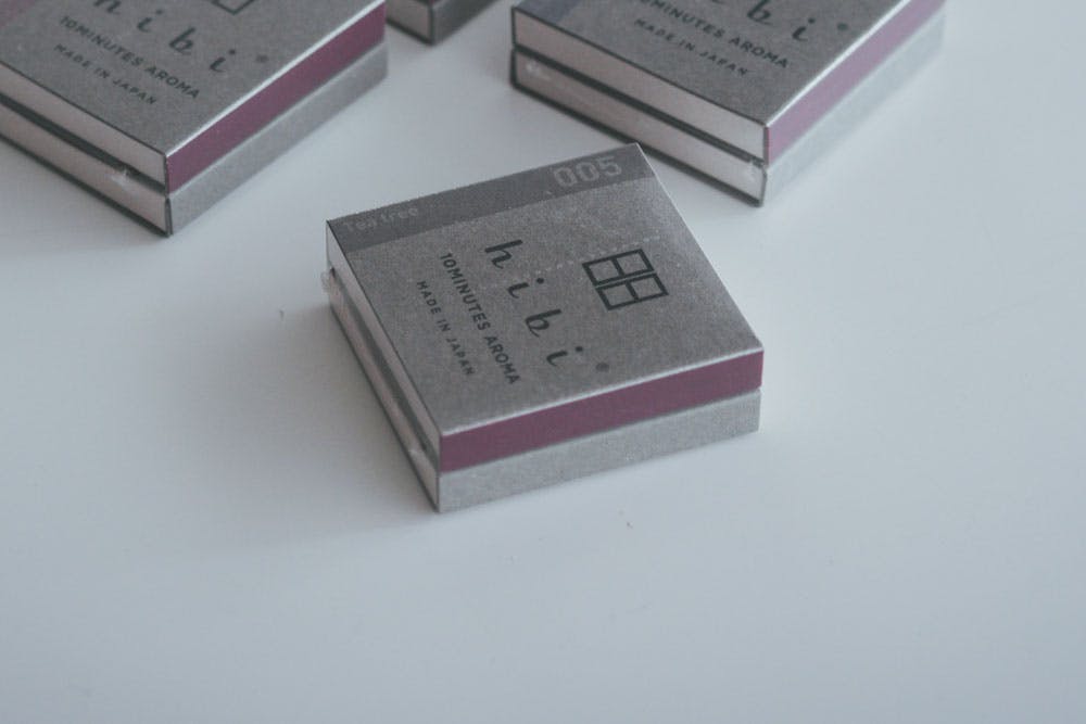 マッチ棒の軸の部分をお香でつくり、擦っても折れない強度を持ち、さらに放香性も探求。約3年の月日をかけてhibiが生まれました。