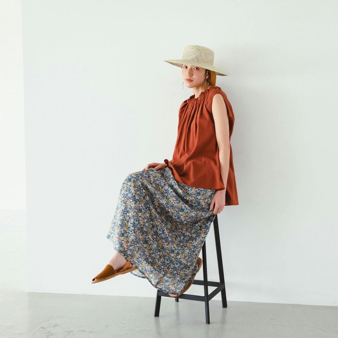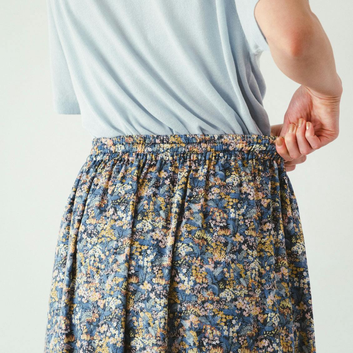 そこで今回、華やかなリバティプリントを使って、とっておきのスカートをつくりました。色は当店だけの別注カラーです。