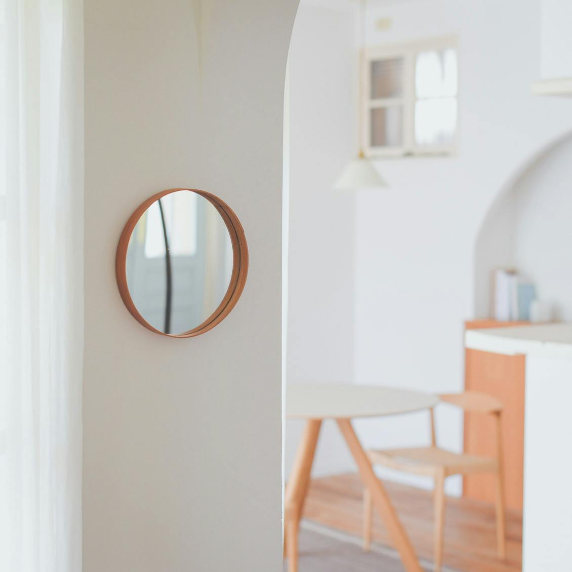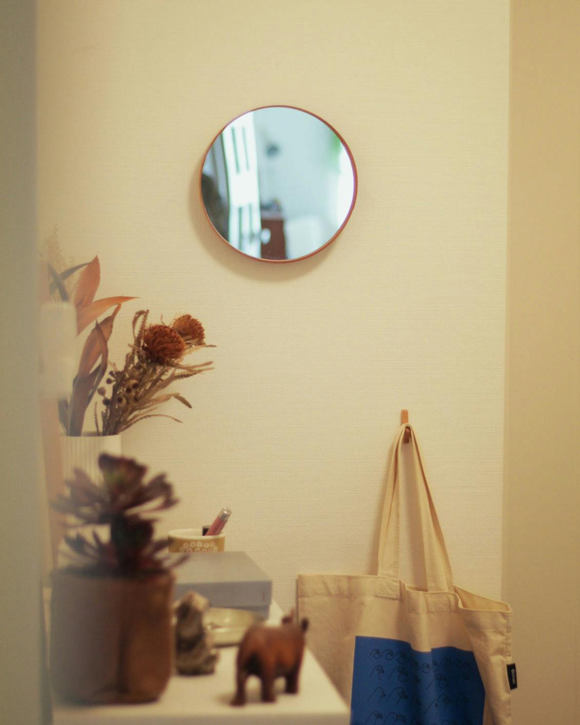 「小ぶりな円形ミラー」をかけてみたら、がらんとした壁がほどよく埋まって、ちょっぴり楽しげな景色に変わりました。