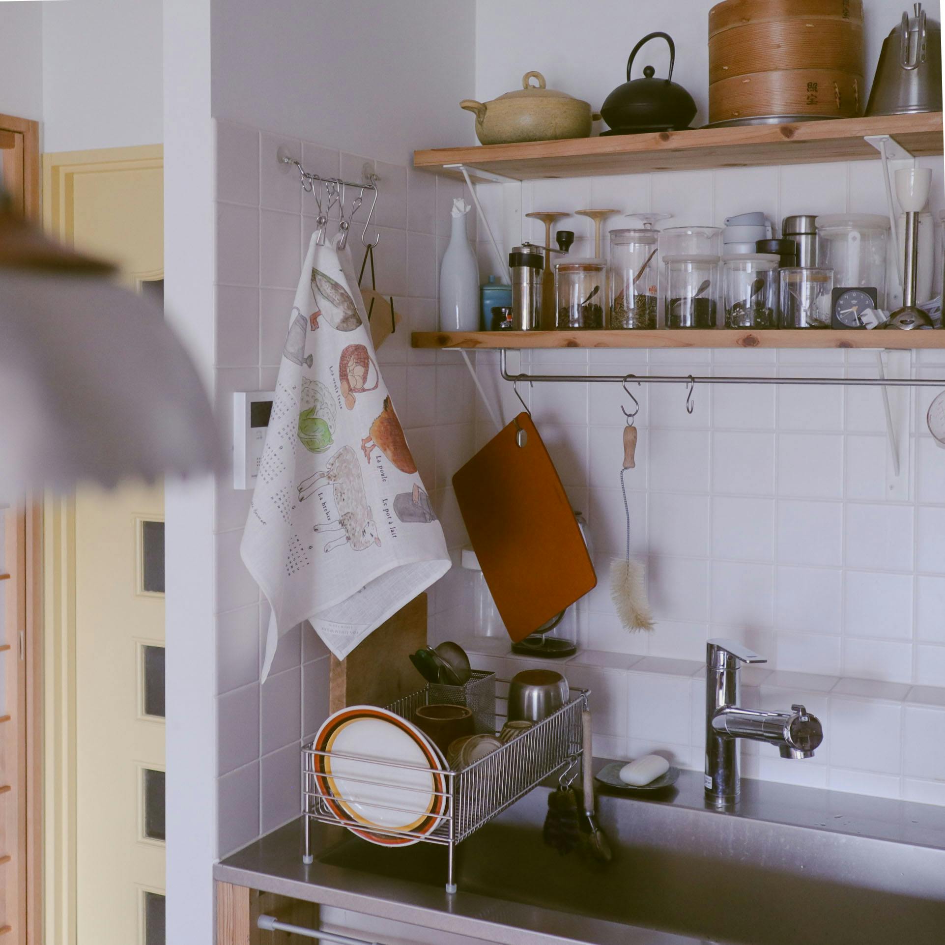 「キッチンクロスとして使うイメージで吊るしてみると、