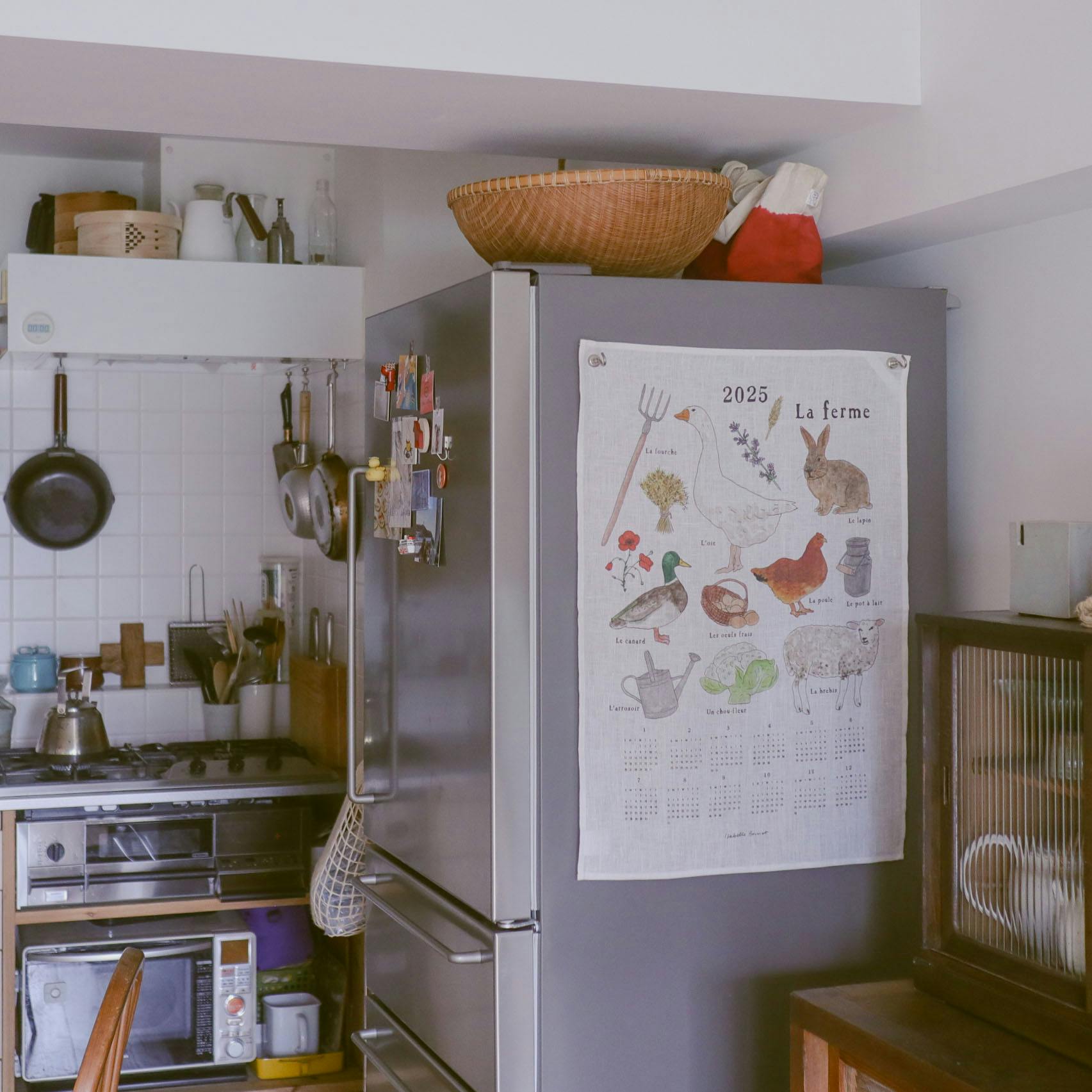 「飾る場所をささっと自由に変えられるのも、リネンカレンダーの良いところ。細い画鋲で簡単にとまり、紙のポスターと違って穴が気にならないんです。