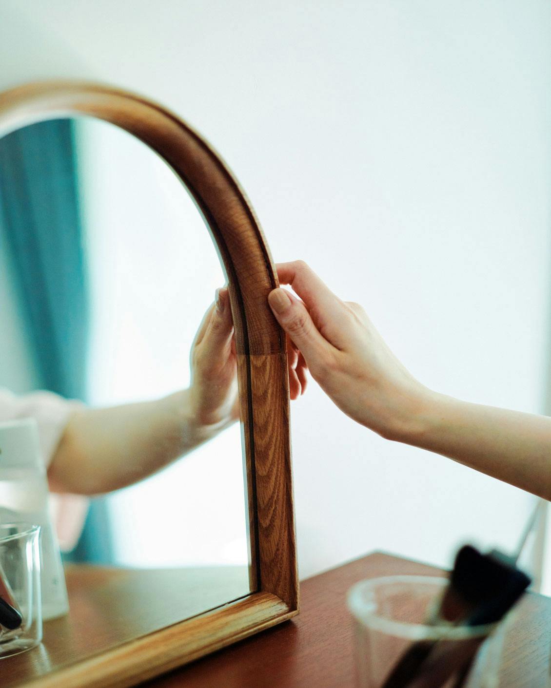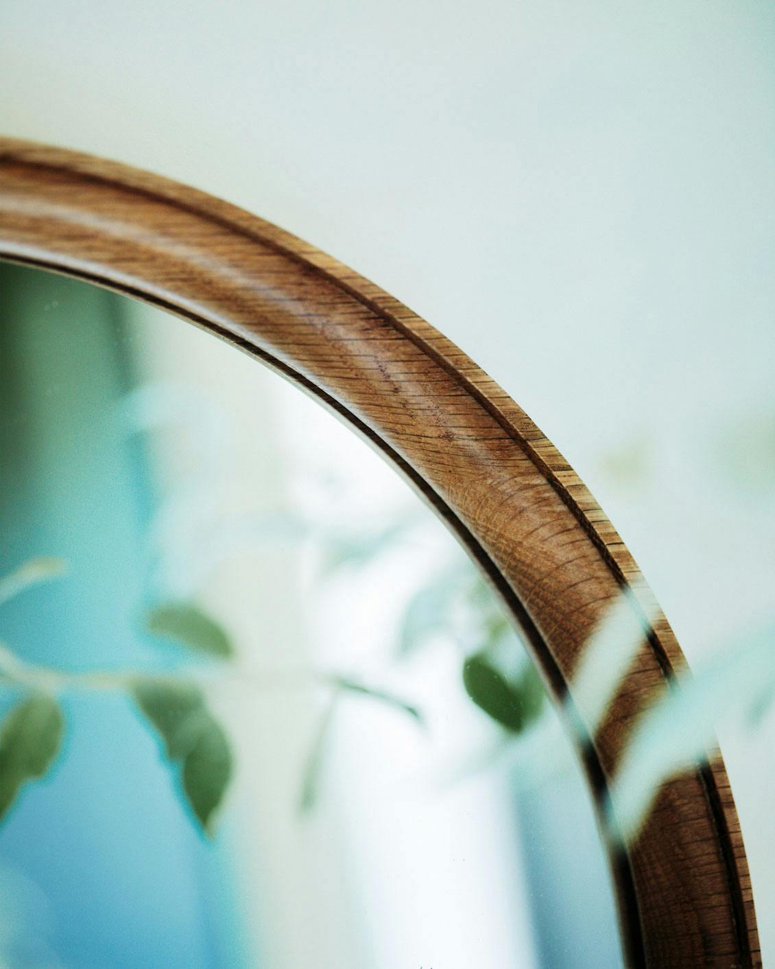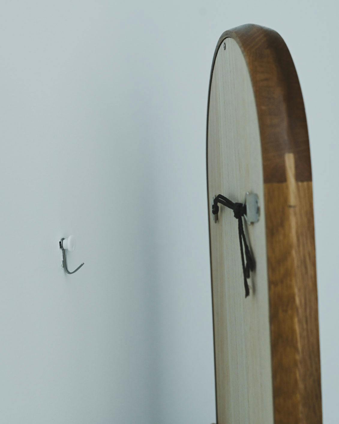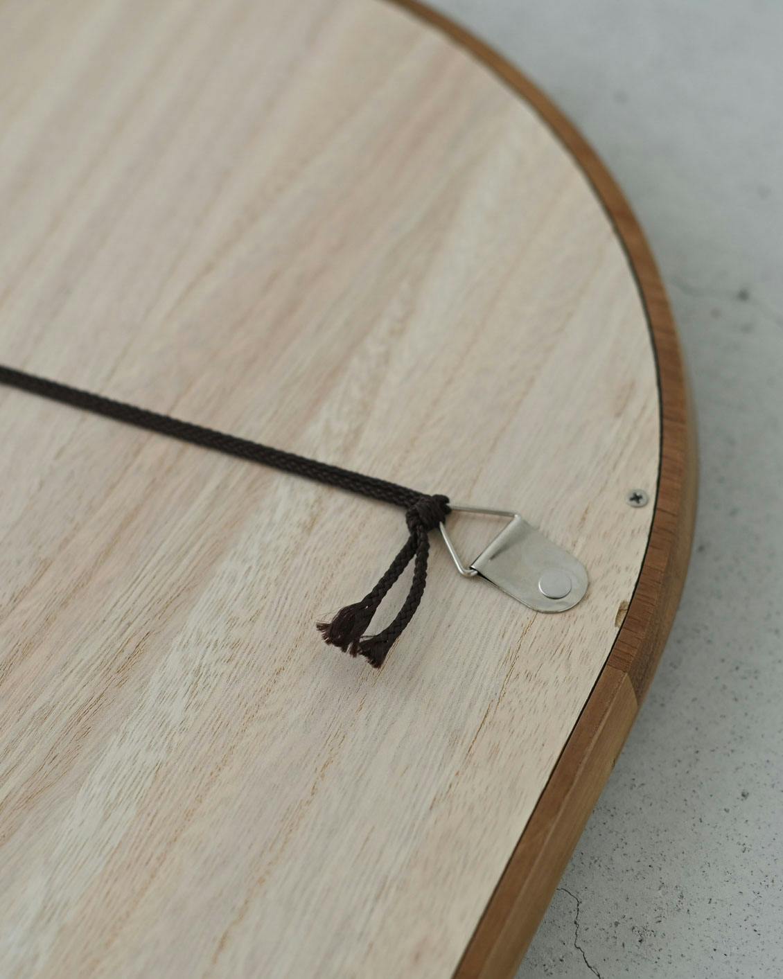 鏡の木枠には、強度もしっかりとあり、家具にも使われるオーク材を採用しました。どんなインテリアにもなじみやすい色味であり、上質な雰囲気をもっています。