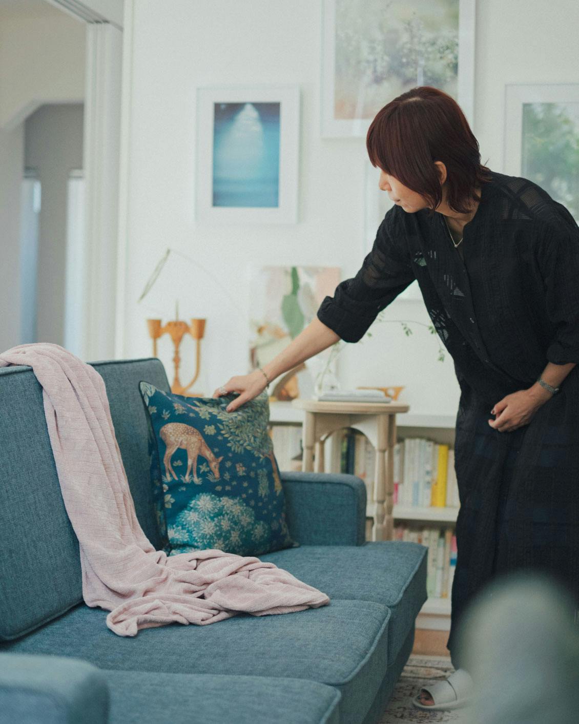ベーシックカラーのソファともよく馴染みますし、木の家具の中でも映えて、インテリアを引き締めてくれるんですよね」