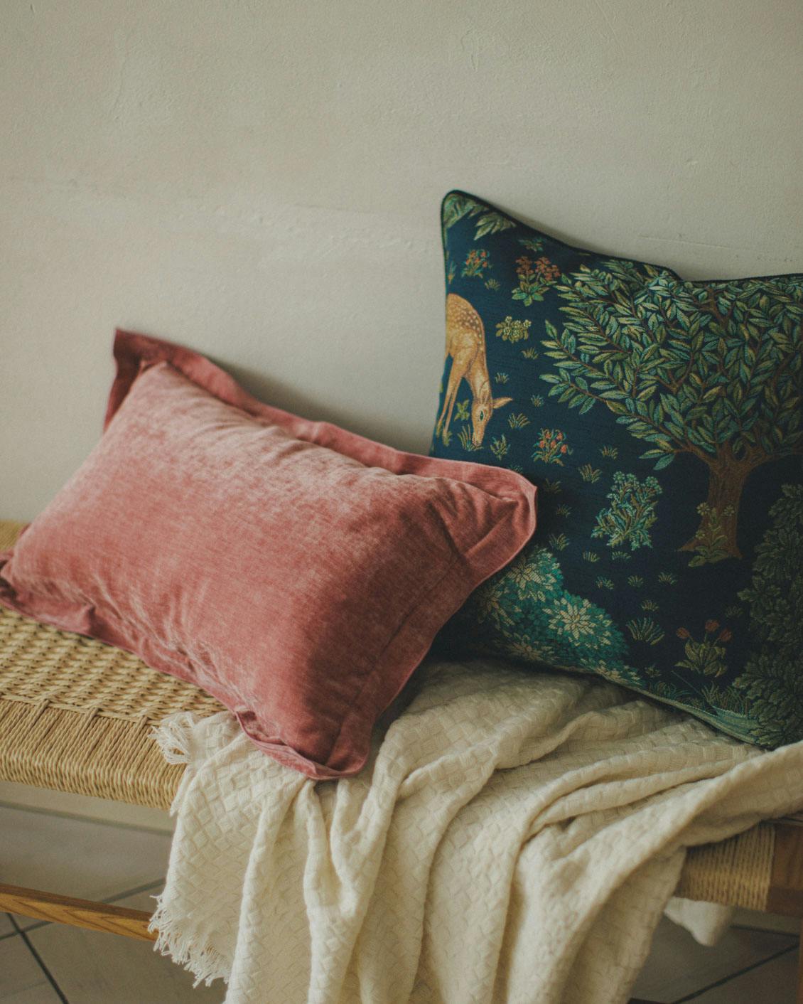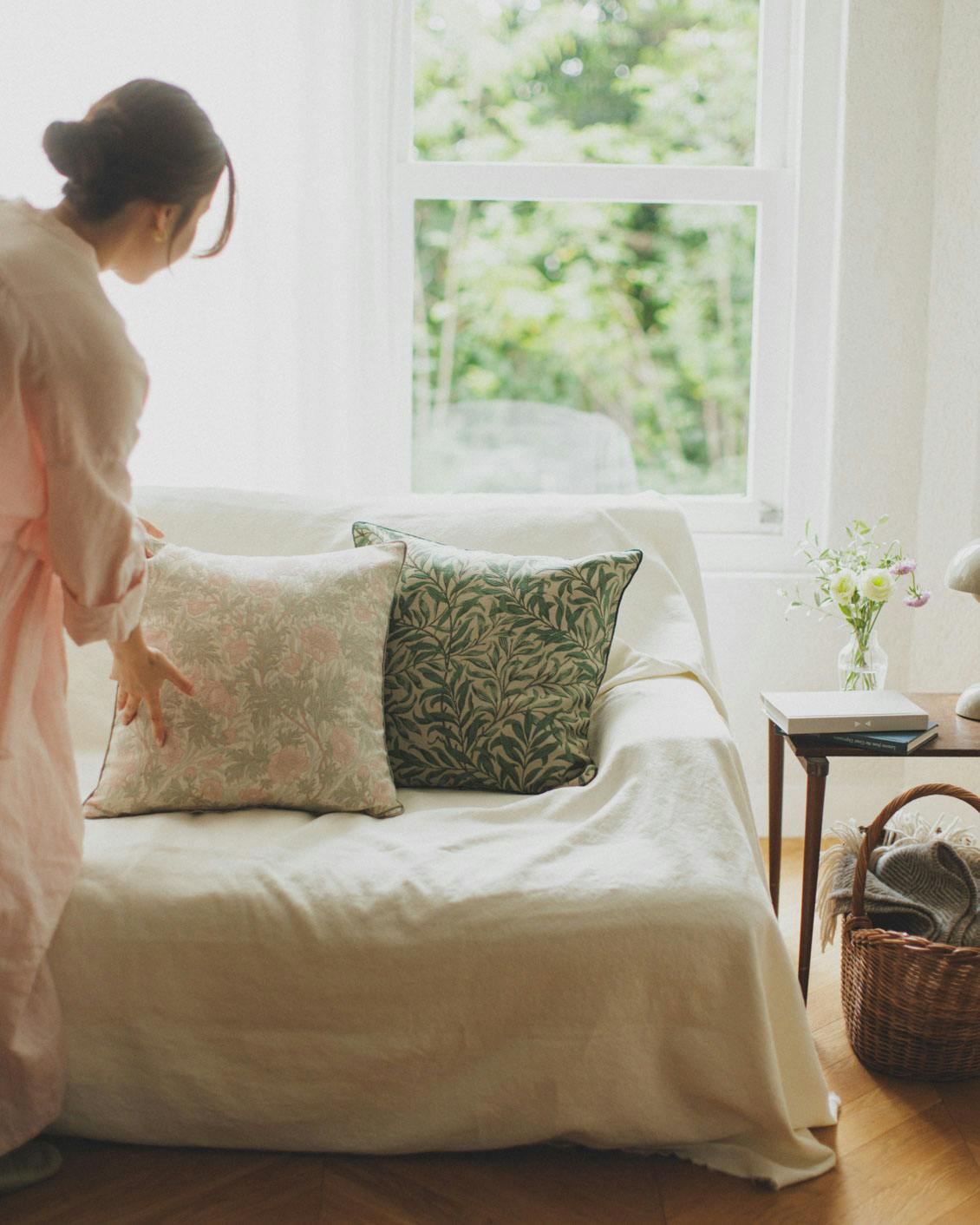 そんな想いを募らせて、今回モリスのテキスタイルを贅沢に使い、お部屋に置くだけで気持ちまで華やぐようなクッションカバーを企画しました。
