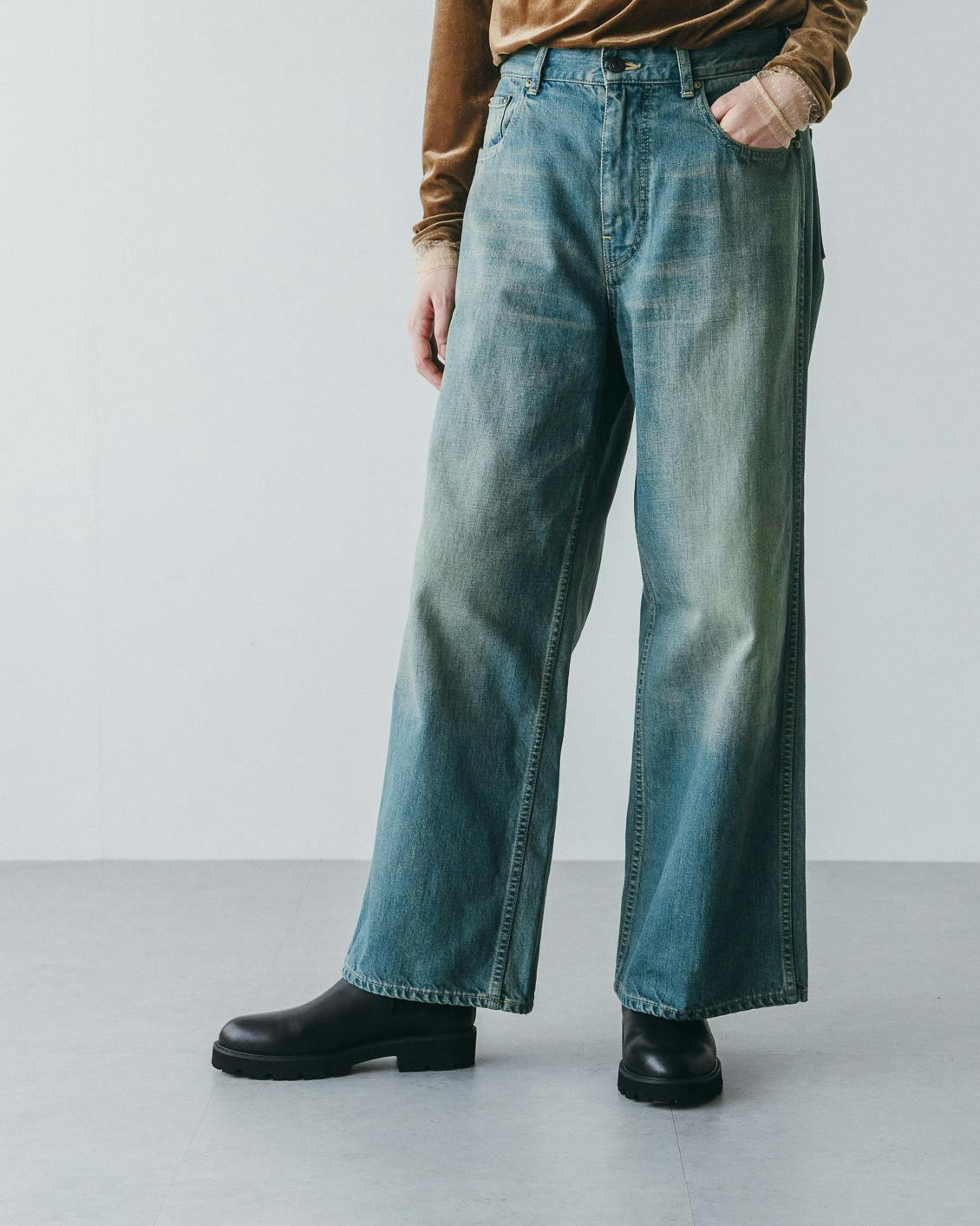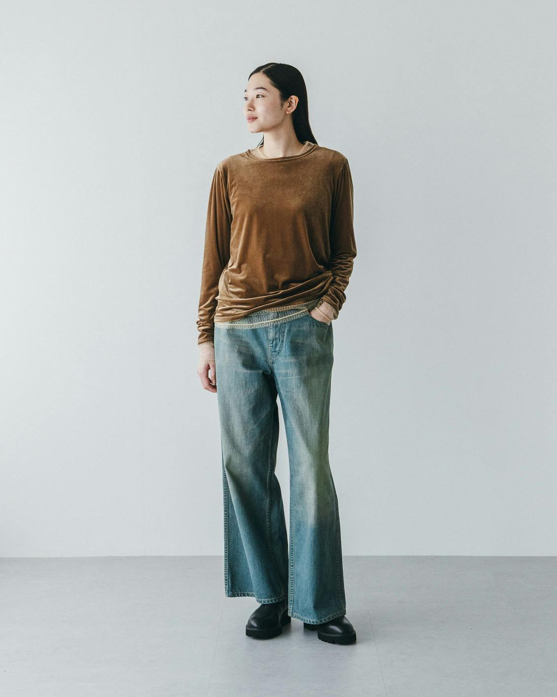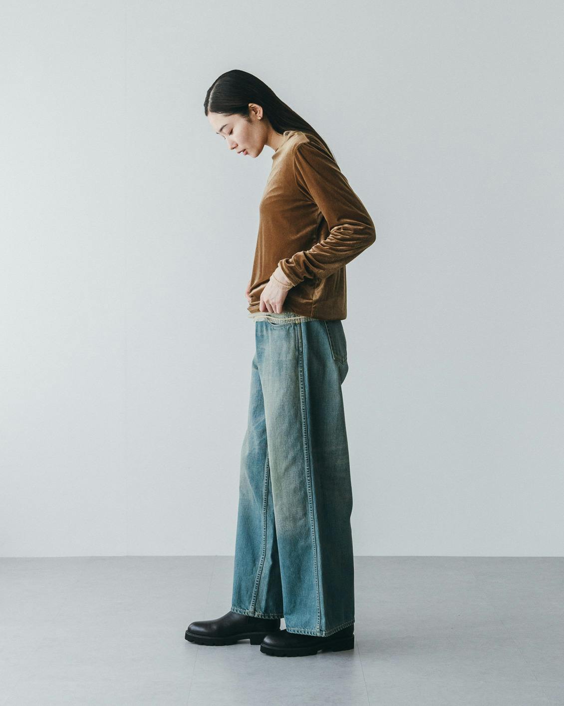 パンツから覗く足元のシルエットが美しいから、デニムとトップスのシンプルなワンツーコーデも品よくまとまります。
