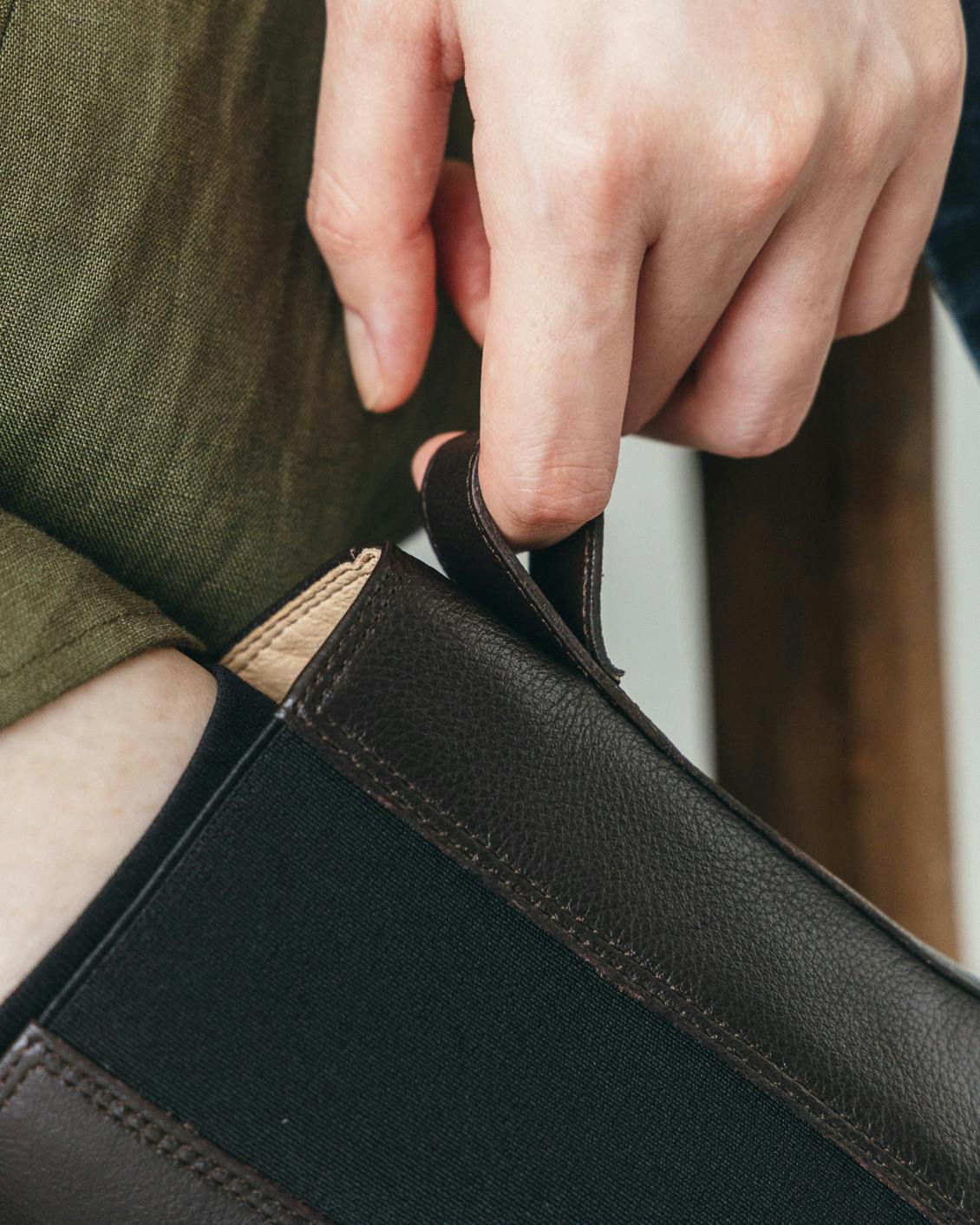 ブラウンのブーツも、ゴムの色は黒を選んでいて、全体の印象を引き締めます。