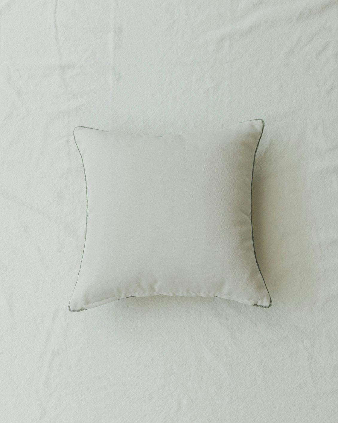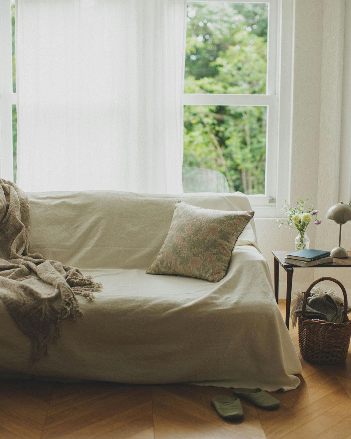 裏面はさらりとした風合いの無地のオフホワイト。合わせるクッションや気分によって表裏で印象を変えて楽しんでいただけます。