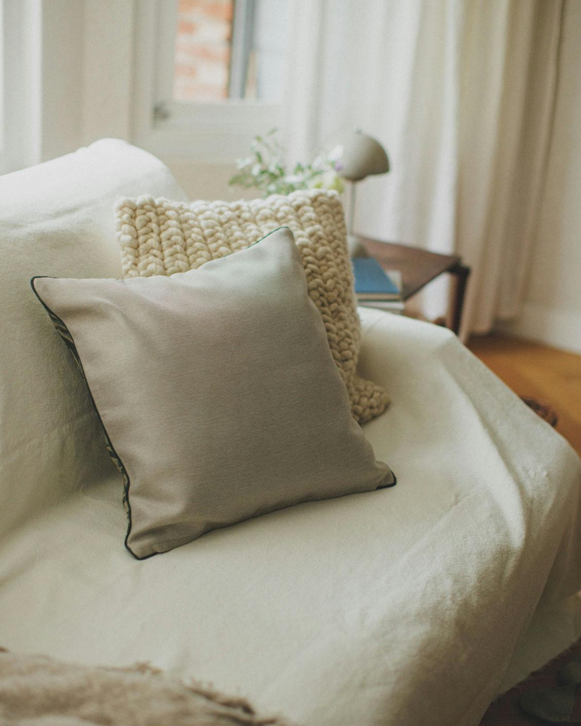 裏面はより自然な風合い、コットンライクな無地のライトグレー。合わせるクッションや気分によって表裏で印象を変えて楽しんでいただけます。