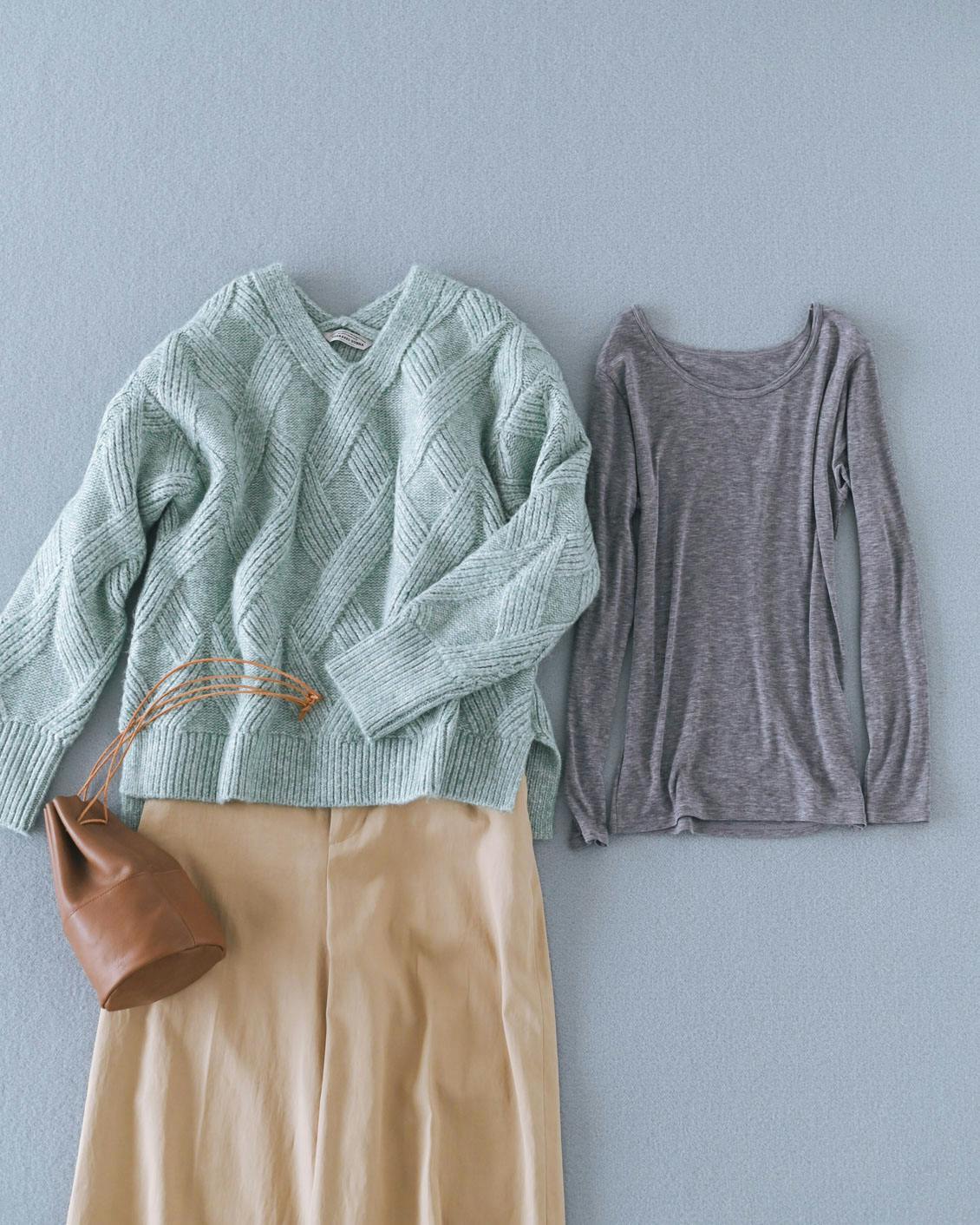 手首にかかる10分袖なので、薄手のニットでも半端な部分に段差が出ず、スッキリ着られますよ。
