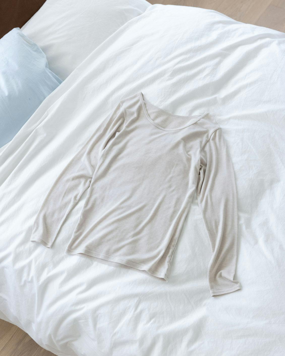 しっとり滑らかなリヨセルと合わさることで、袖を通した瞬間から気持ちよく、やさしいぬくもりで寒さから身体を守ってくれます。