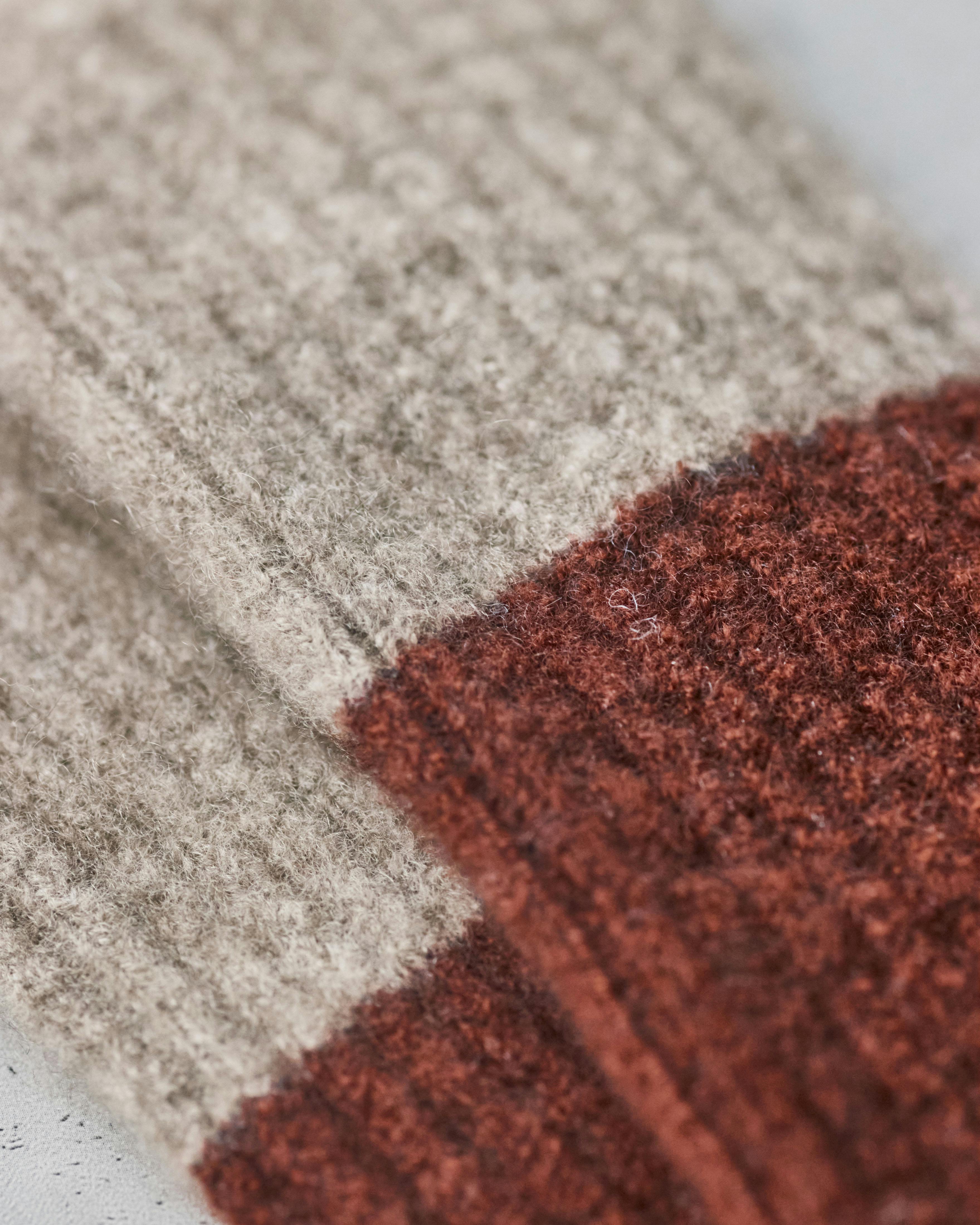 ベージュの部分は、通常のカシミヤの原毛色で編まれていますが、暖かさに大きな差はないと言われています。