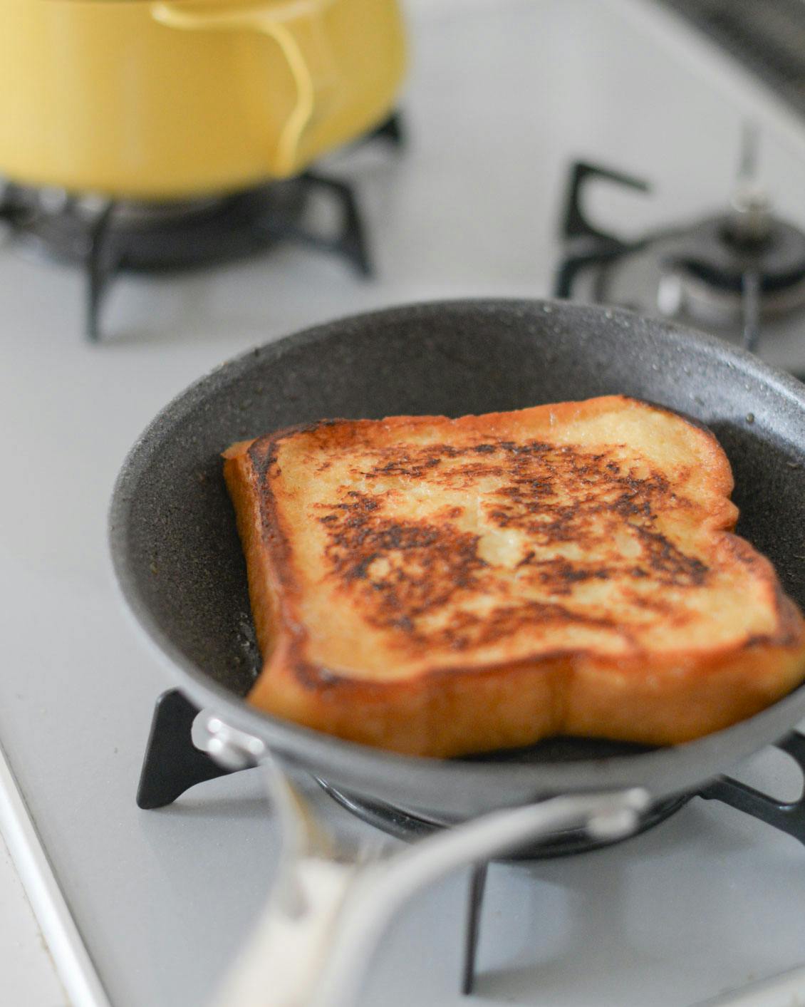 熱がフライパン全体に均一に伝わるので、食材に焼きムラができにくいんです。だから、ハンバーグや鶏肉のソテーはこんがりジューシーに、フレンチトーストや餃子はきれいな焼き目に。