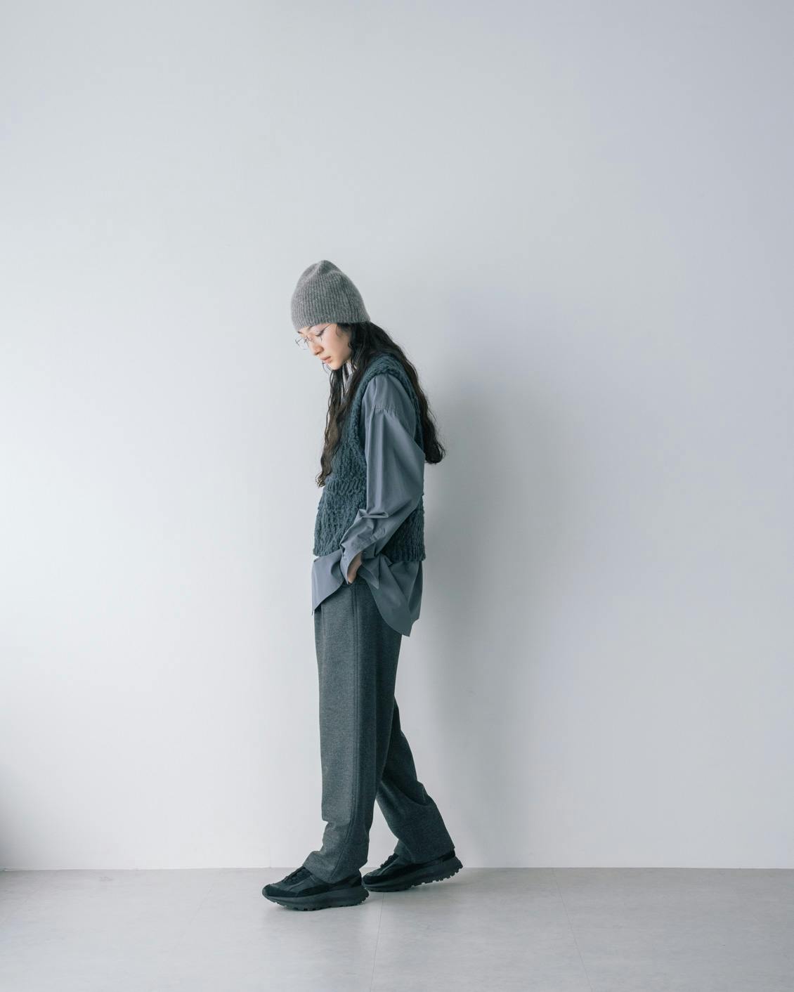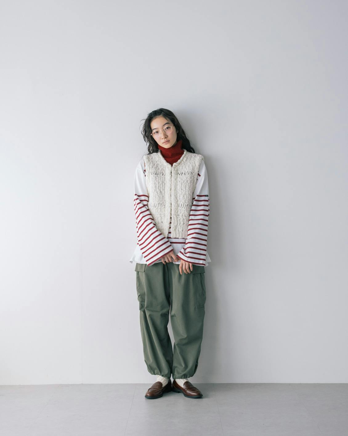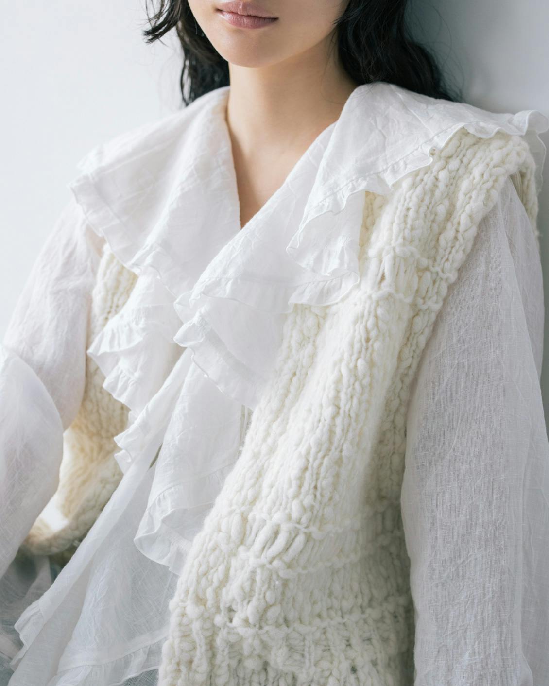 編み柄と糸に個性がある一方で、色はシンプルに単色でまとめています。だから柄物や、デザイントップスにも、軽やかに馴染むこと間違いなし。