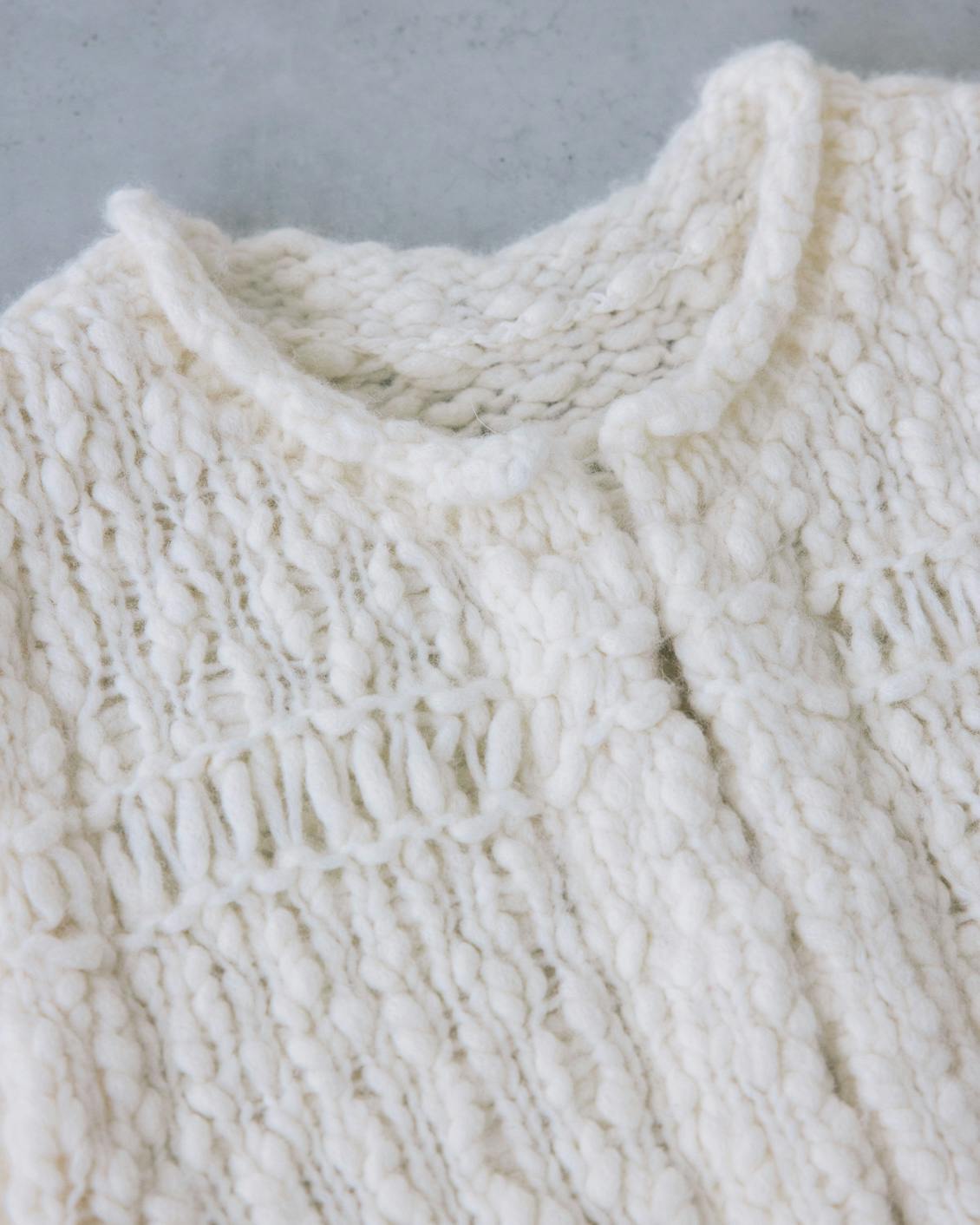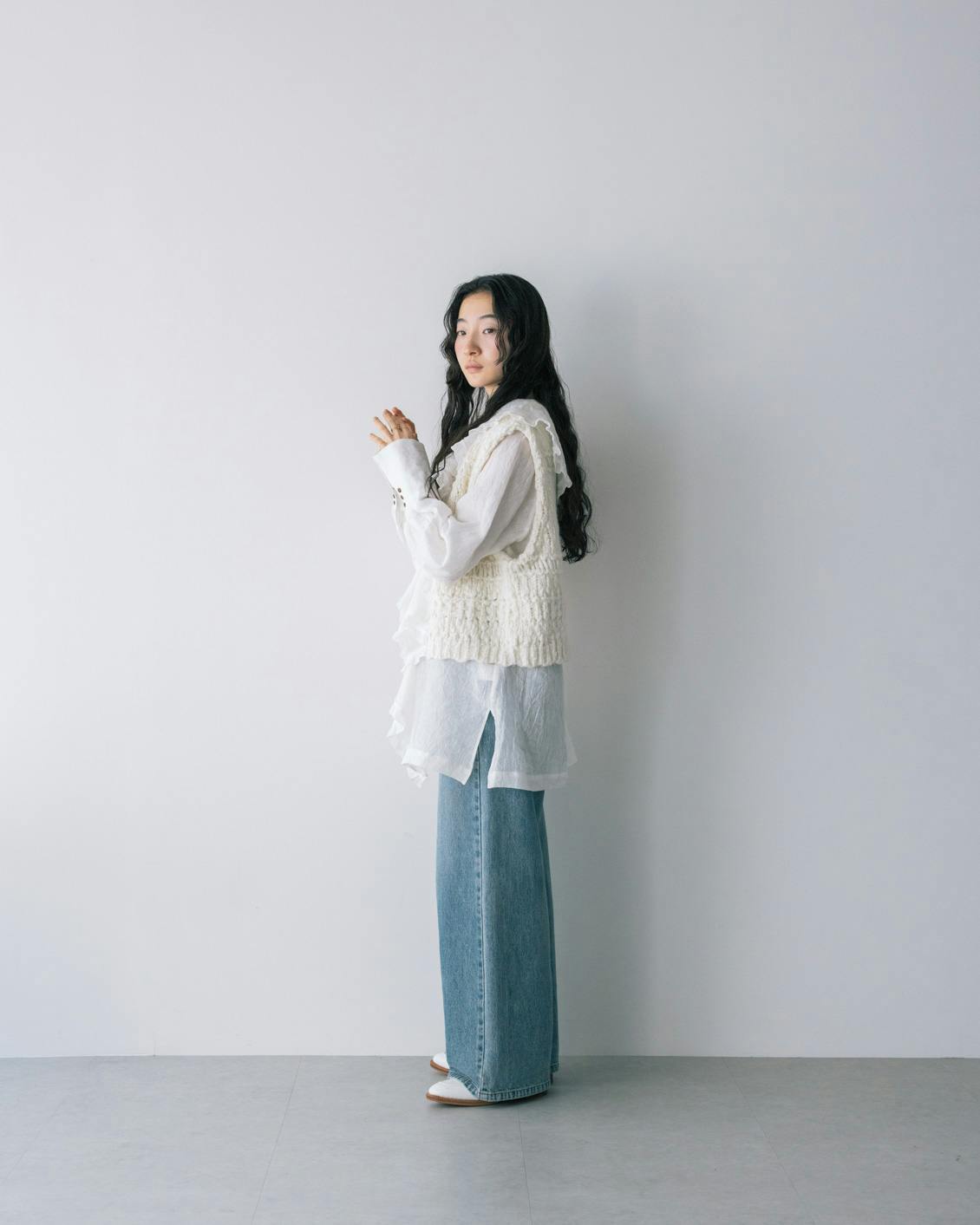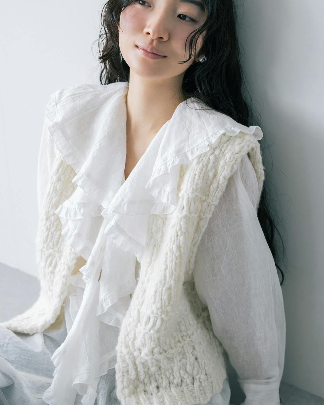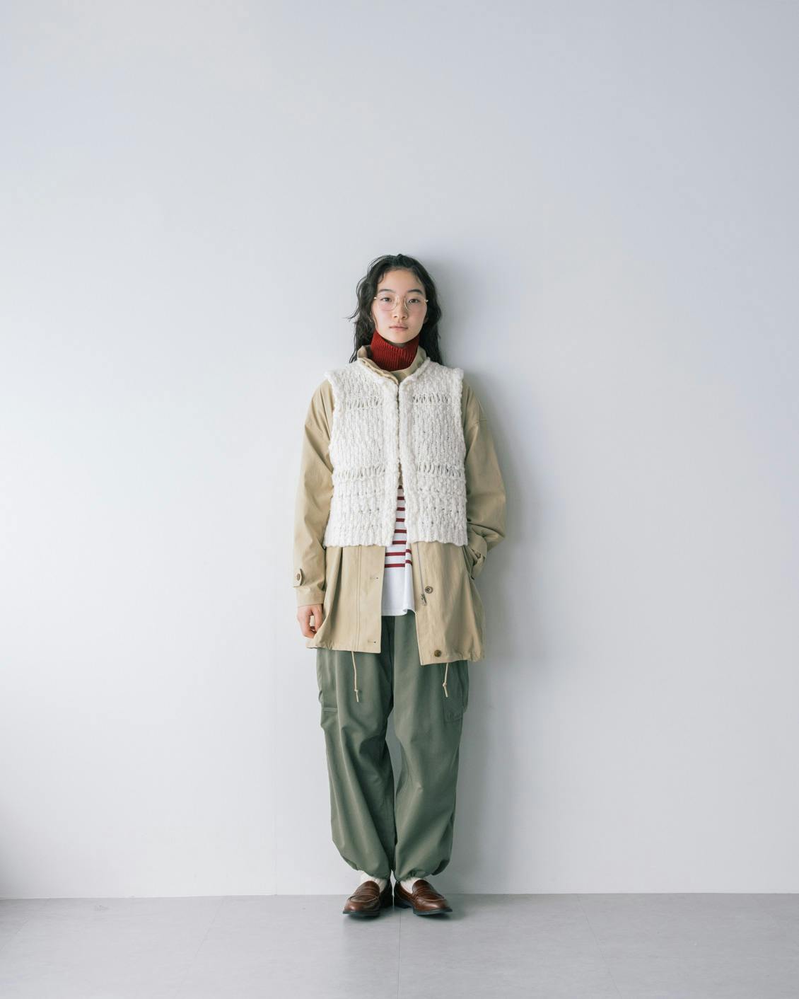 編み柄と糸に個性がある一方で、色はシンプルに単色でまとめています。だから柄物や、デザイントップスにも、軽やかに馴染むこと間違いなし。