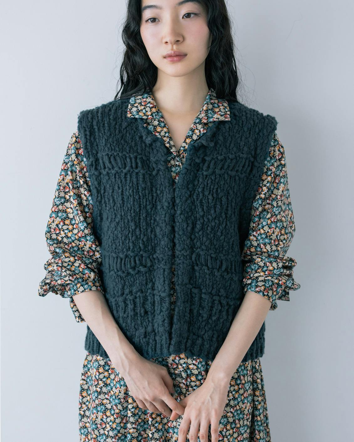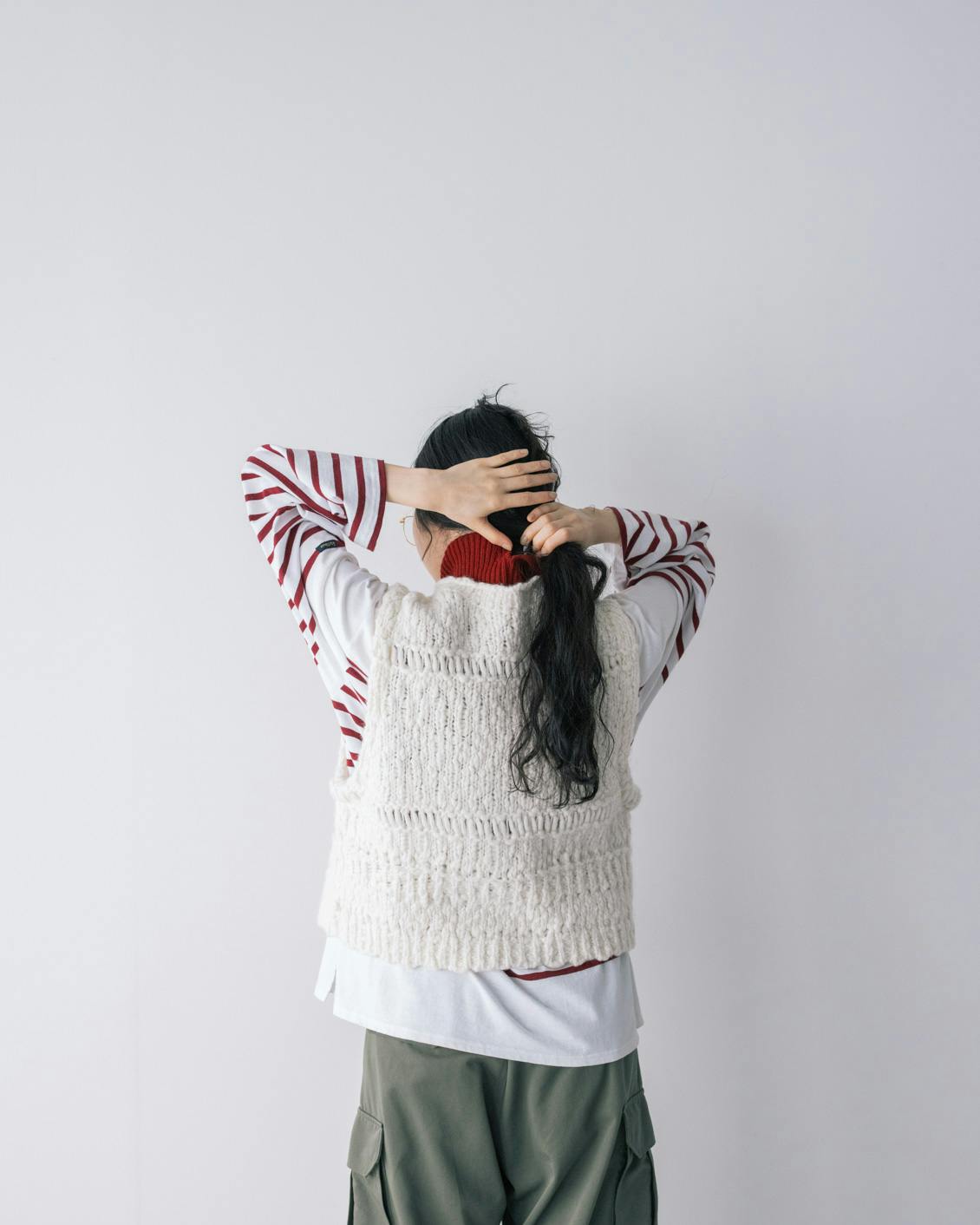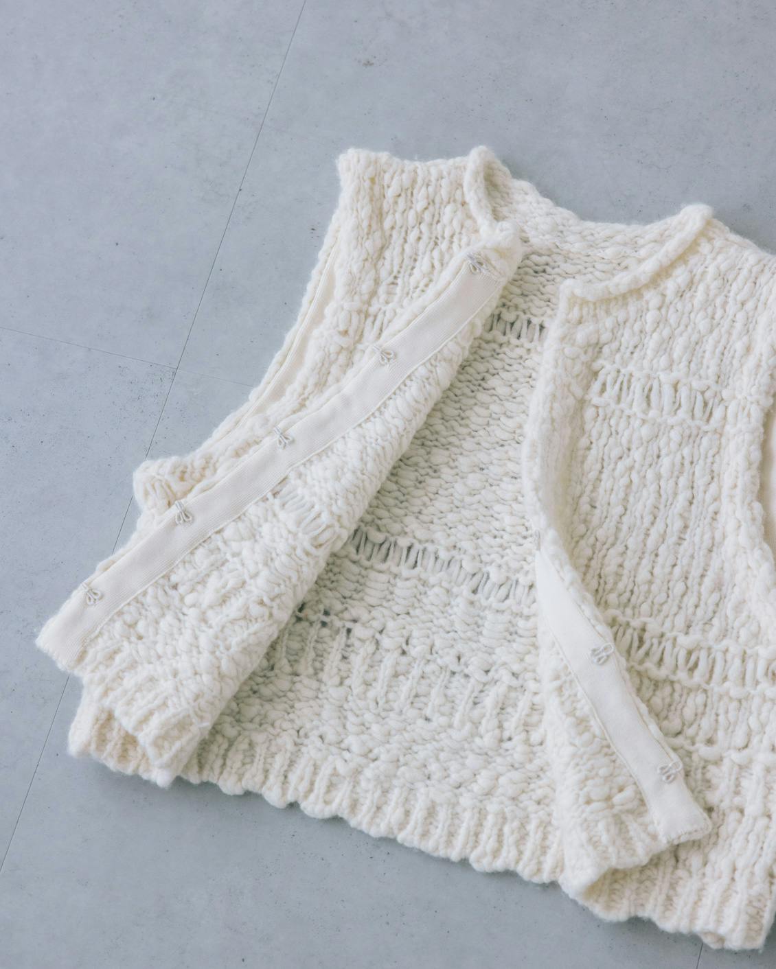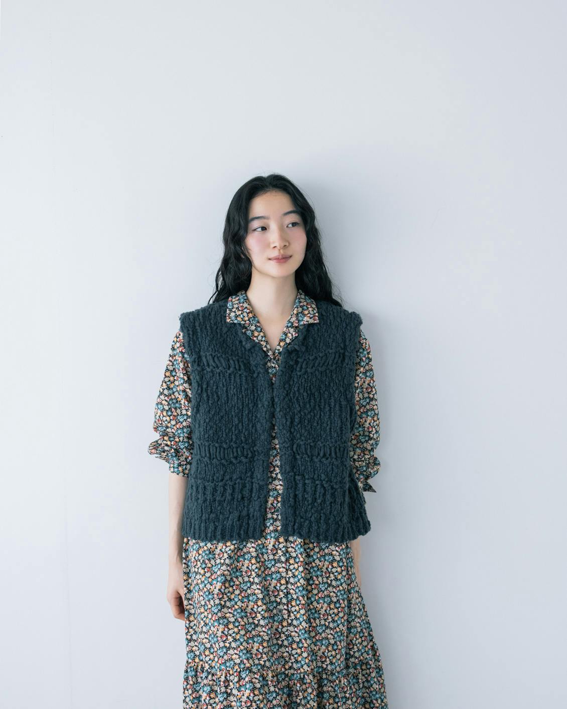 糸の表情が際立つよう編みあげたニットベストは、華やかさだけでなく、デイリーに重宝する優れものです。