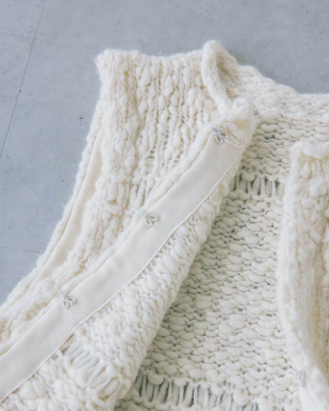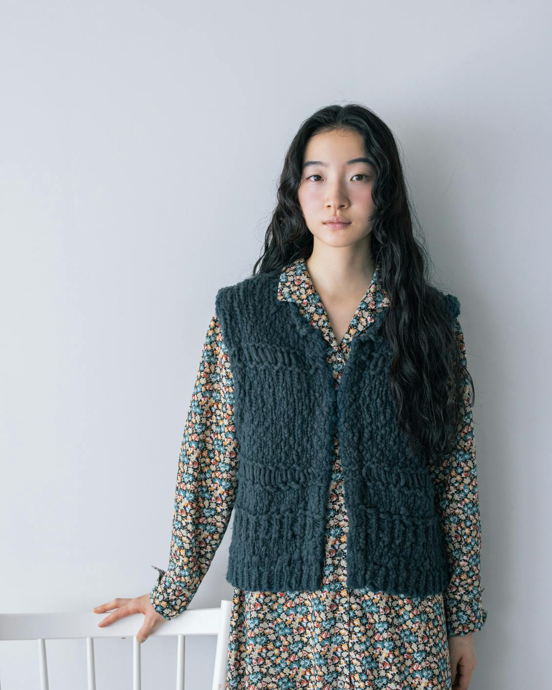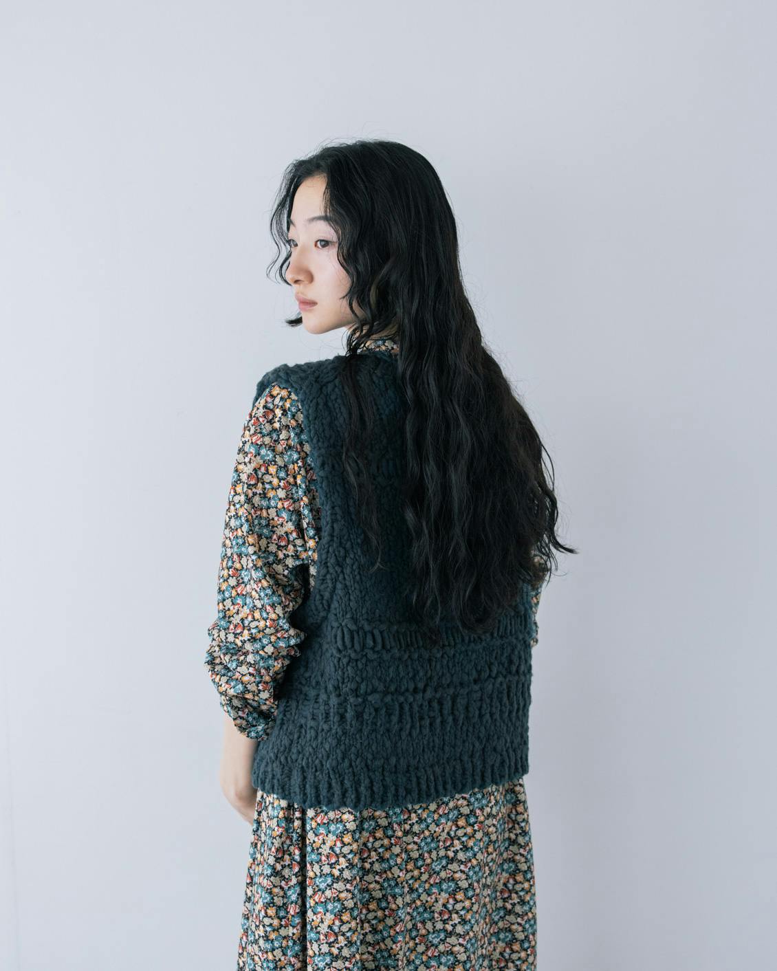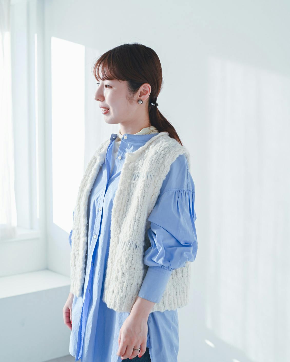 糸の表情が際立つよう編みあげたニットベストは、華やかさだけでなく、デイリーに重宝する優れものです。