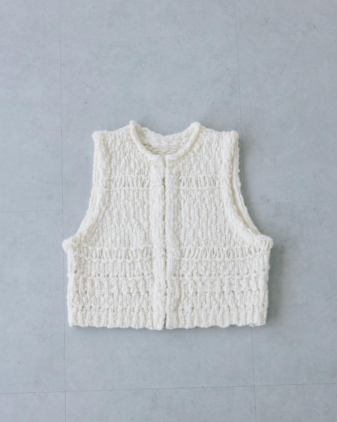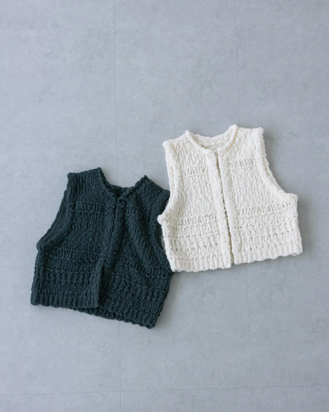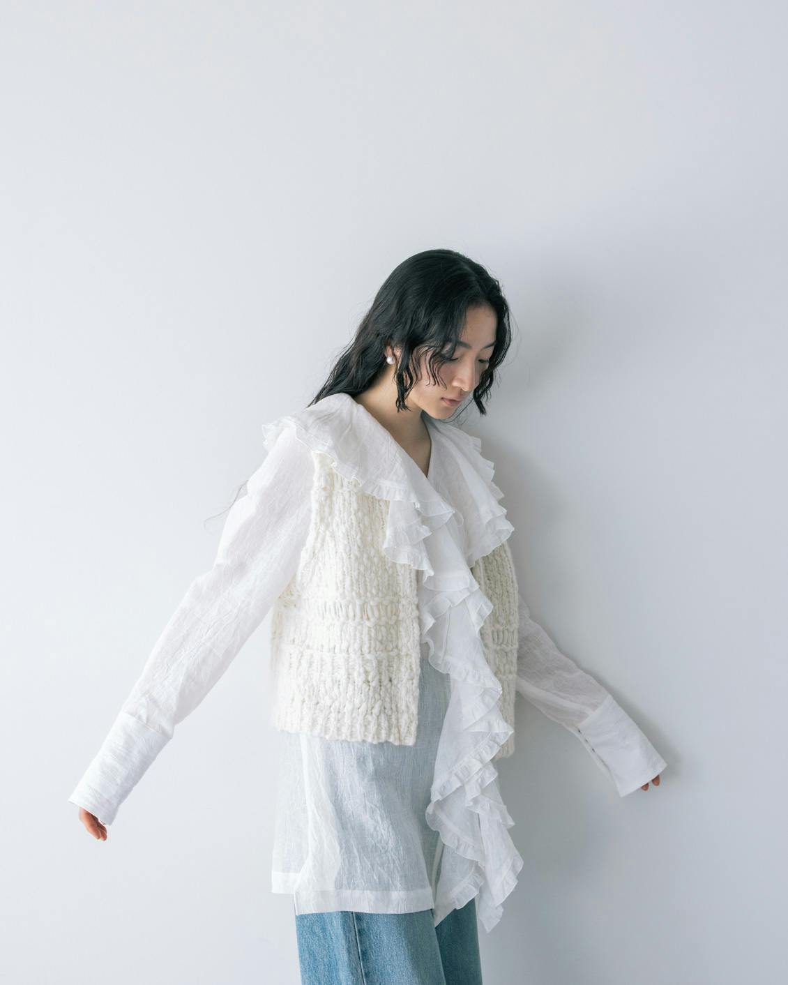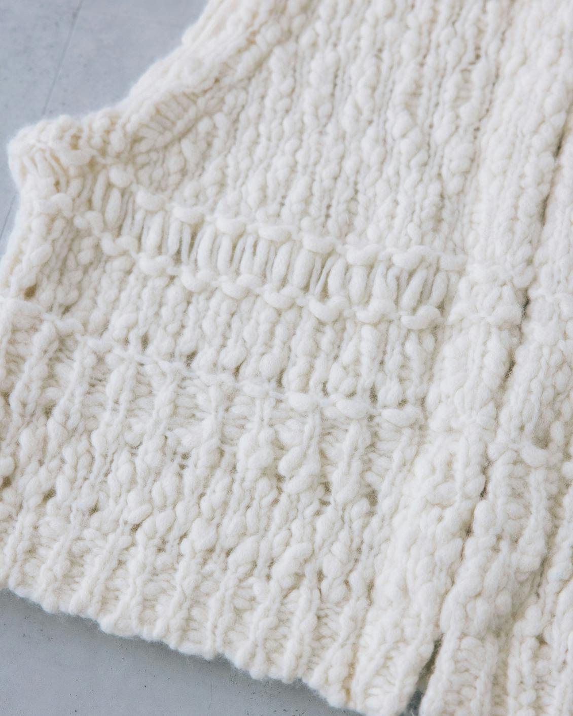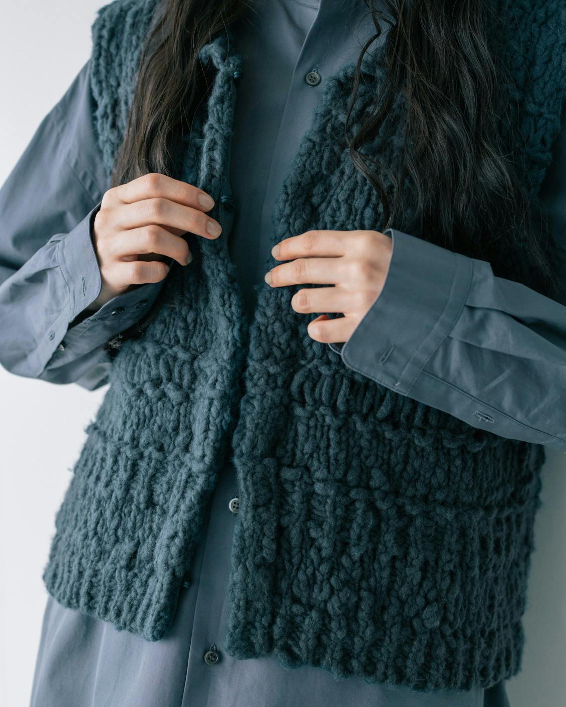 糸の表情が際立つよう編みあげたニットベストは、華やかさだけでなく、デイリーに重宝する優れものです。