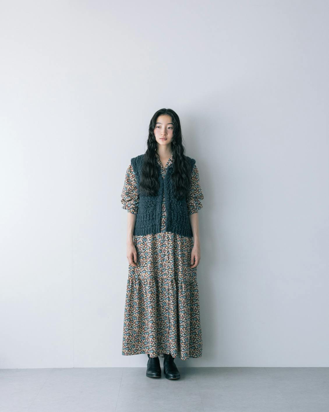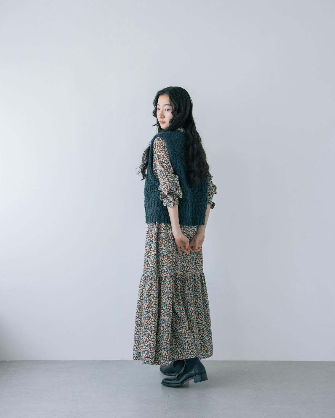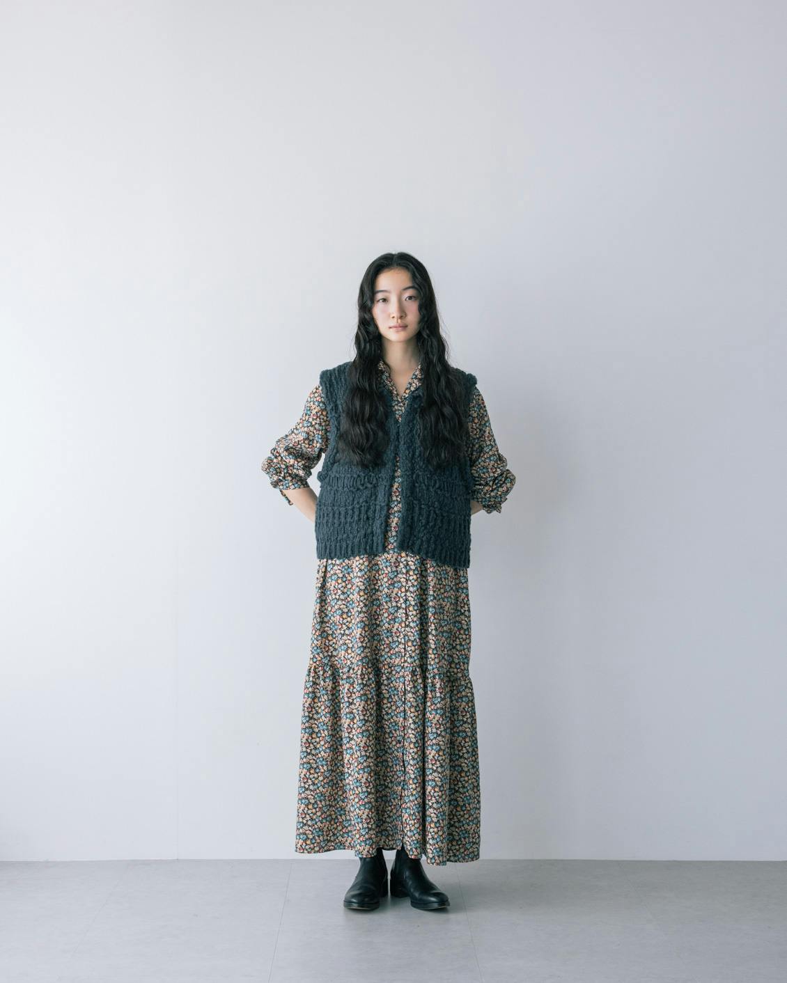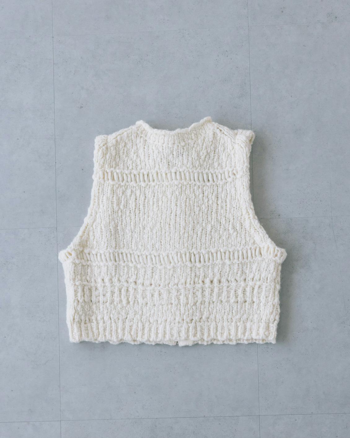 糸の表情が際立つよう編みあげたニットベストは、華やかさだけでなく、デイリーに重宝する優れものです。
