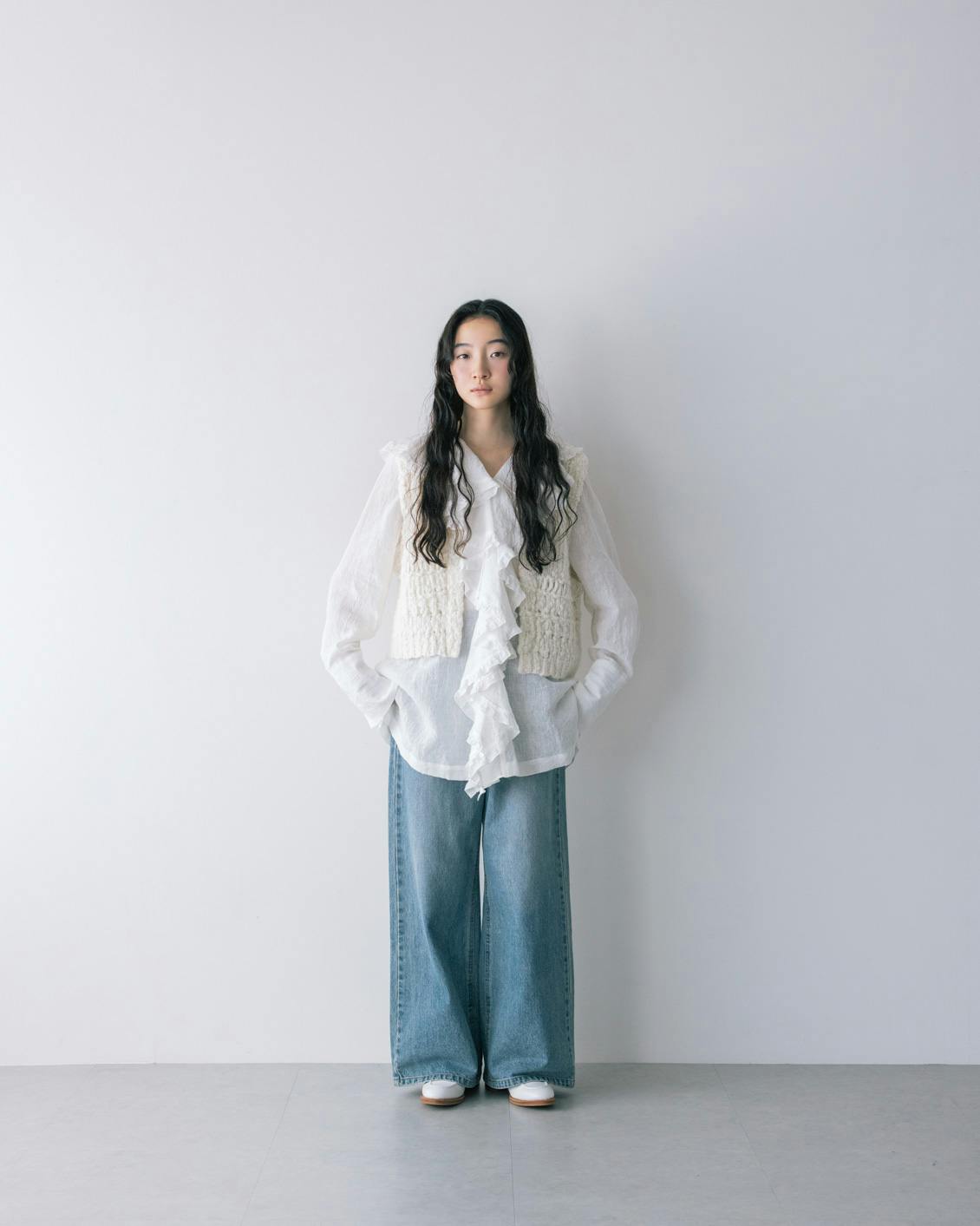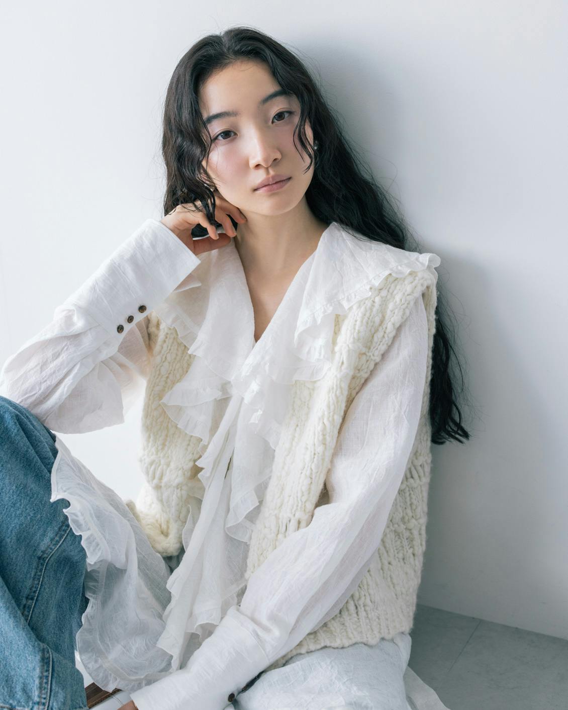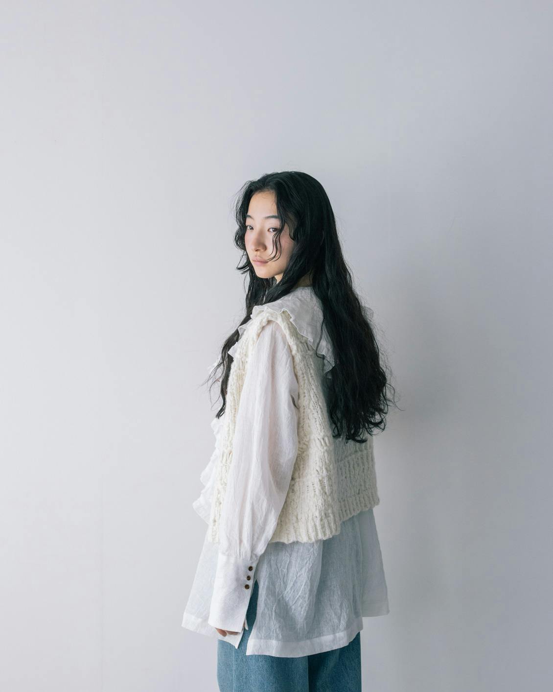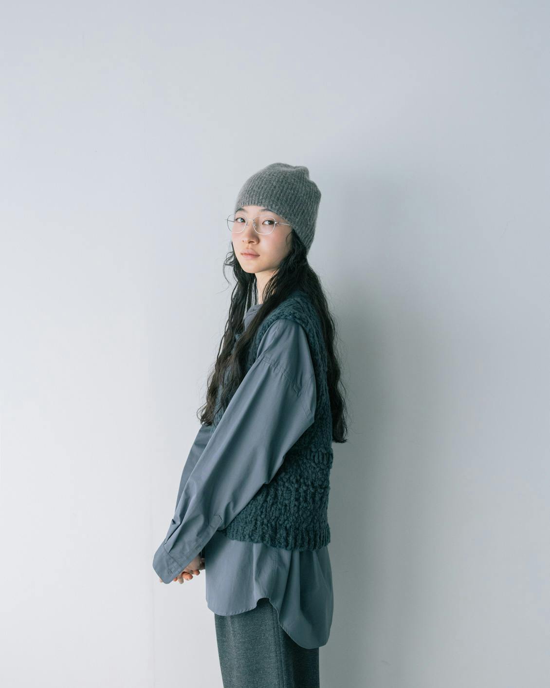 まず最初にこだわったのは肩幅。ここが広すぎると上半身が大きく見えるため、肩の一番外側の骨のラインが出る長さに調整。このラインを見せることで、ボリューム感あるニットベストでも、華奢な印象がグッと引き立ちます。