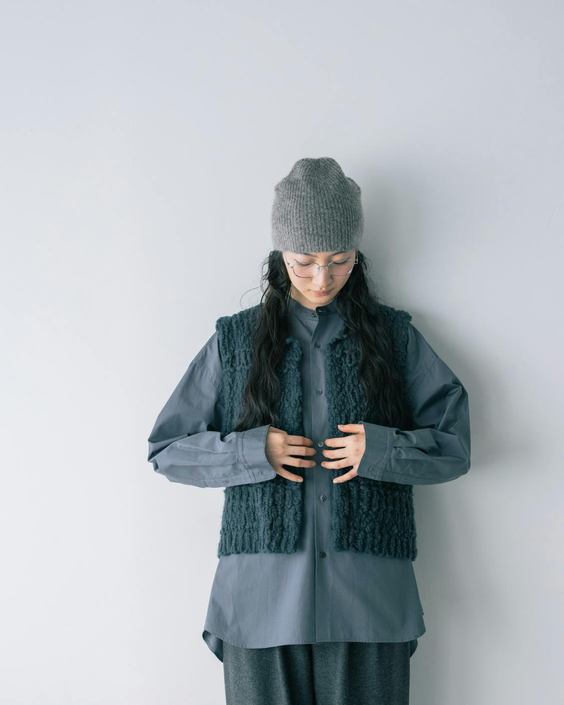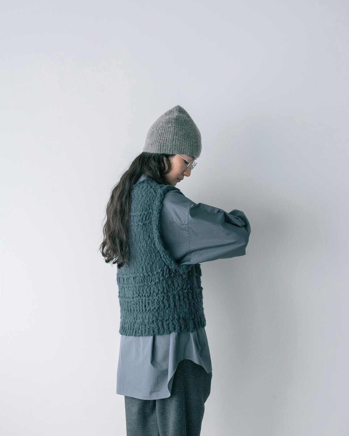 だからこの糸を活かして、編み柄も設計。ややアクセントを効かせたデザインにし、ちょっぴり個性を持たせました。ザクっと編んだような、抜け感あるラフなテイストが魅力です。