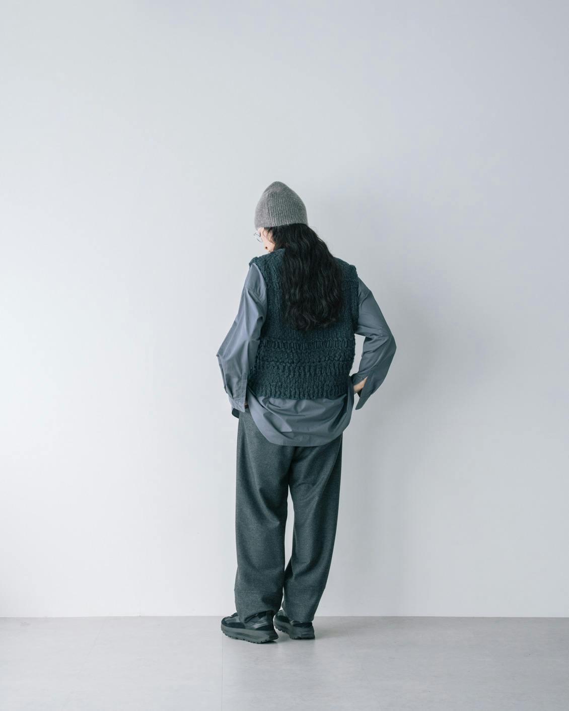 そこでこのベストは、シルエットでその問題を解決することに。誰が着ても、すらりとした印象の、抜け感のあるラインになるよう設計しています。