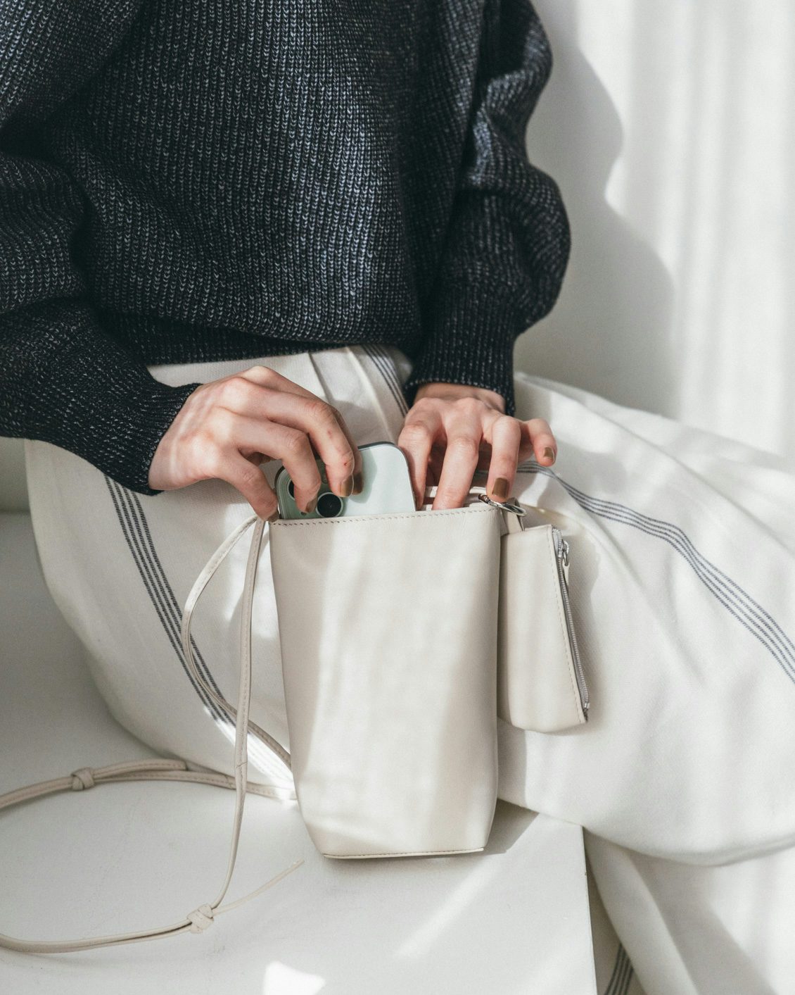 ミニポーチはファスナー以外は縫製を表に出さず、つるんとニュートラルな印象にしました。細部までこだわって、上品な佇まいを形にしています。