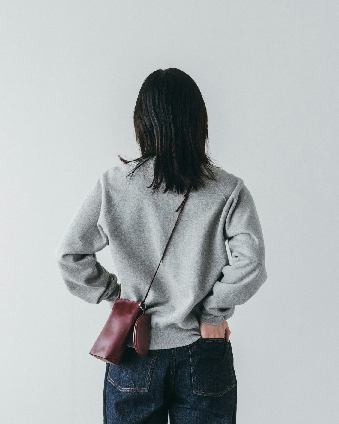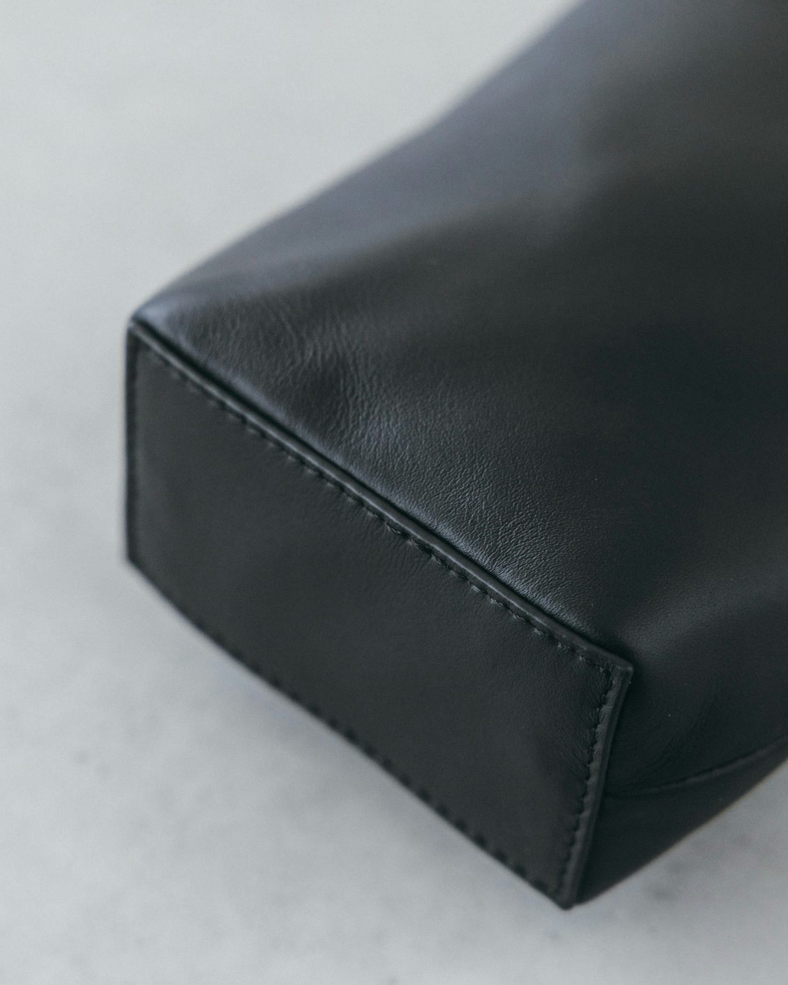 細やかなシボ感のレザーで、モダンなすっきりとした表情。控えめなツヤが感じられるものを選びました。