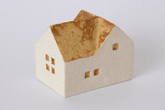 陶器作家・よしおかれいさんが作る手のひらにちょこんと乗るサイズの、「家」をモチーフとした陶器の作品。