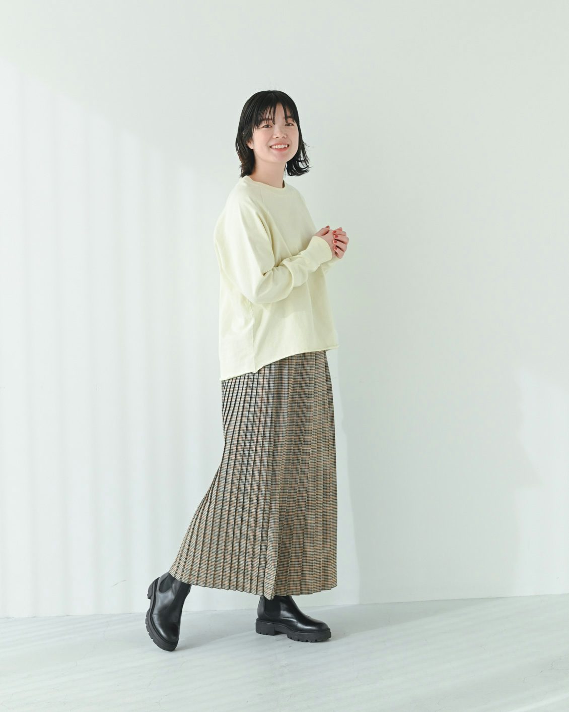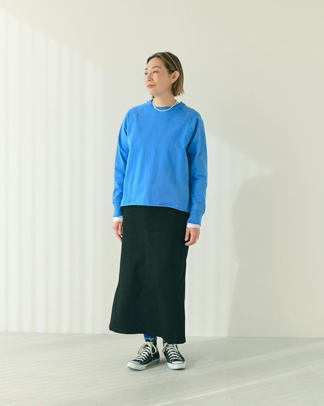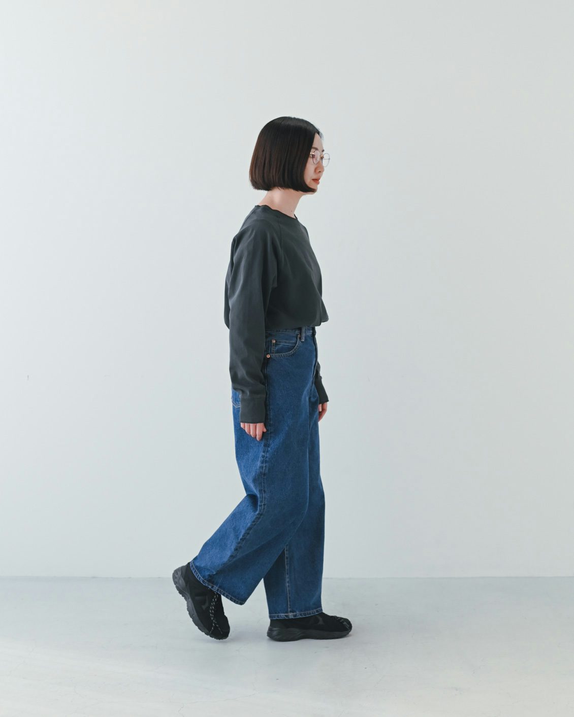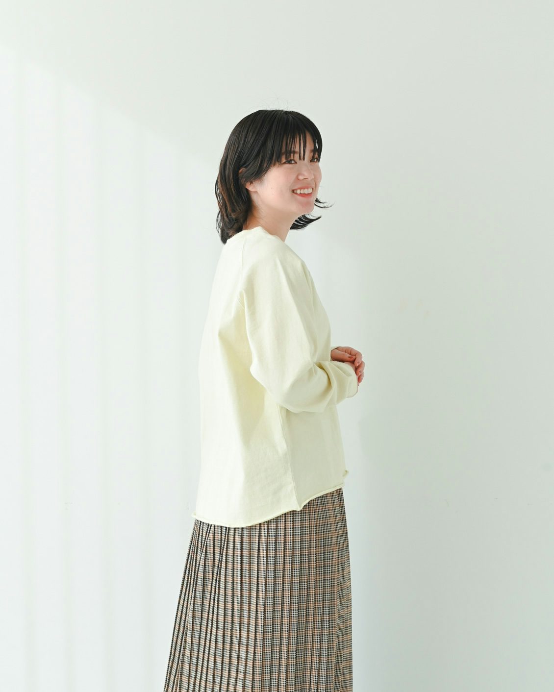 とはいえインもできそうな生地なので、デニムに前だけ少しインしてベルトを覗かせたり、スカートにインしてすっきり着たりと、その日の気分で変えて楽しみたいです」