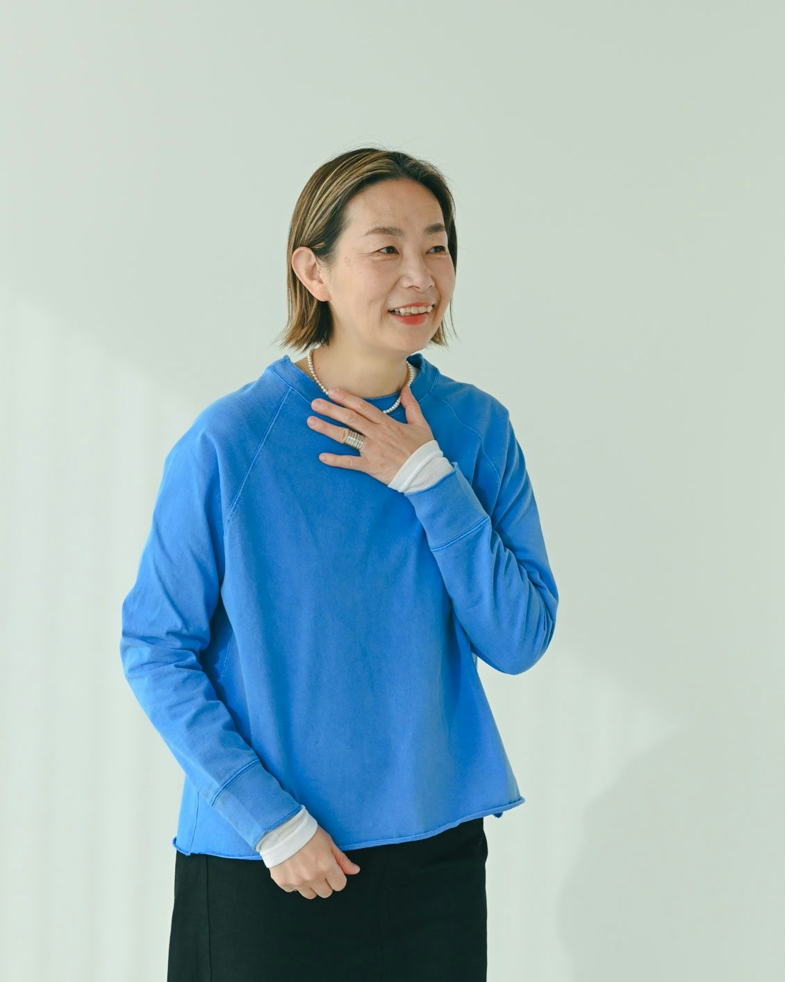 くすみのないすっきりしたトーンなので、私たち世代でも気負わずに着られるカラーだなと思いました。中にシャツを重ねて襟を覗かせると、よりコーディネートに馴染みやすくなっておすすめです」