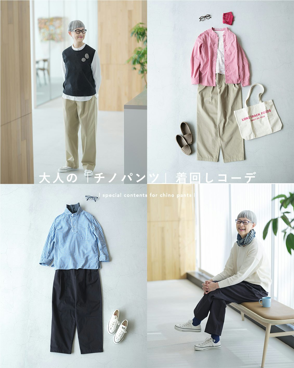 この特集では、当店の特集にもご出演いただきスタッフにもファンが多い小和田妙子さんにチノパンツをはいていただき、この春楽しみたいコーディネートを見せていただきました。