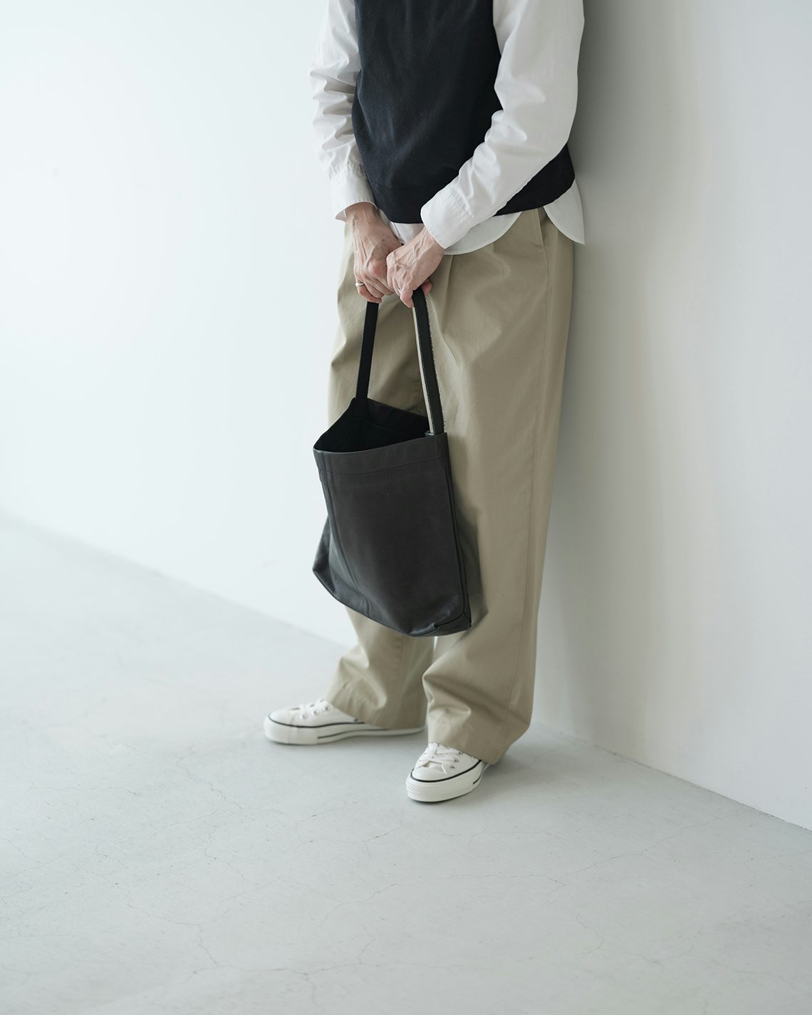 「黒の革バッグと合わせて、コーデの中にラフさと上品な部分をミックスさせると、ぐっとチノパンを大人らしく合わせられると思います」
