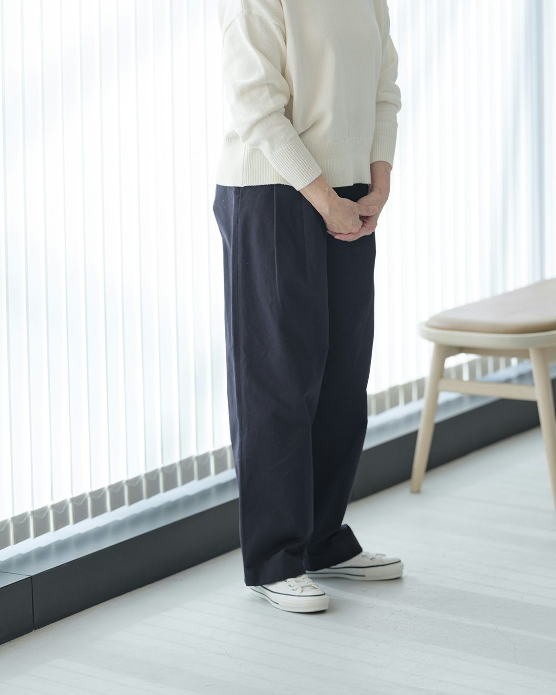 そうお話ししてくださった小和田さんに、ベージュとネイビーのチノパンを使っていただき、春に楽しみたいコーディネートを見せていただきました。