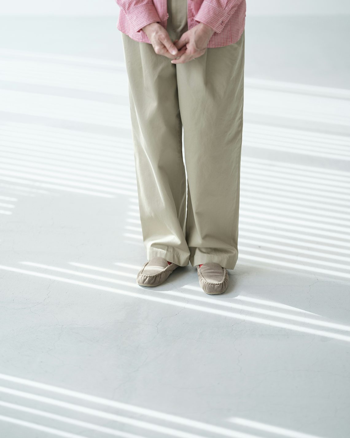 ベージュのチノパンと、ギンガムチェック