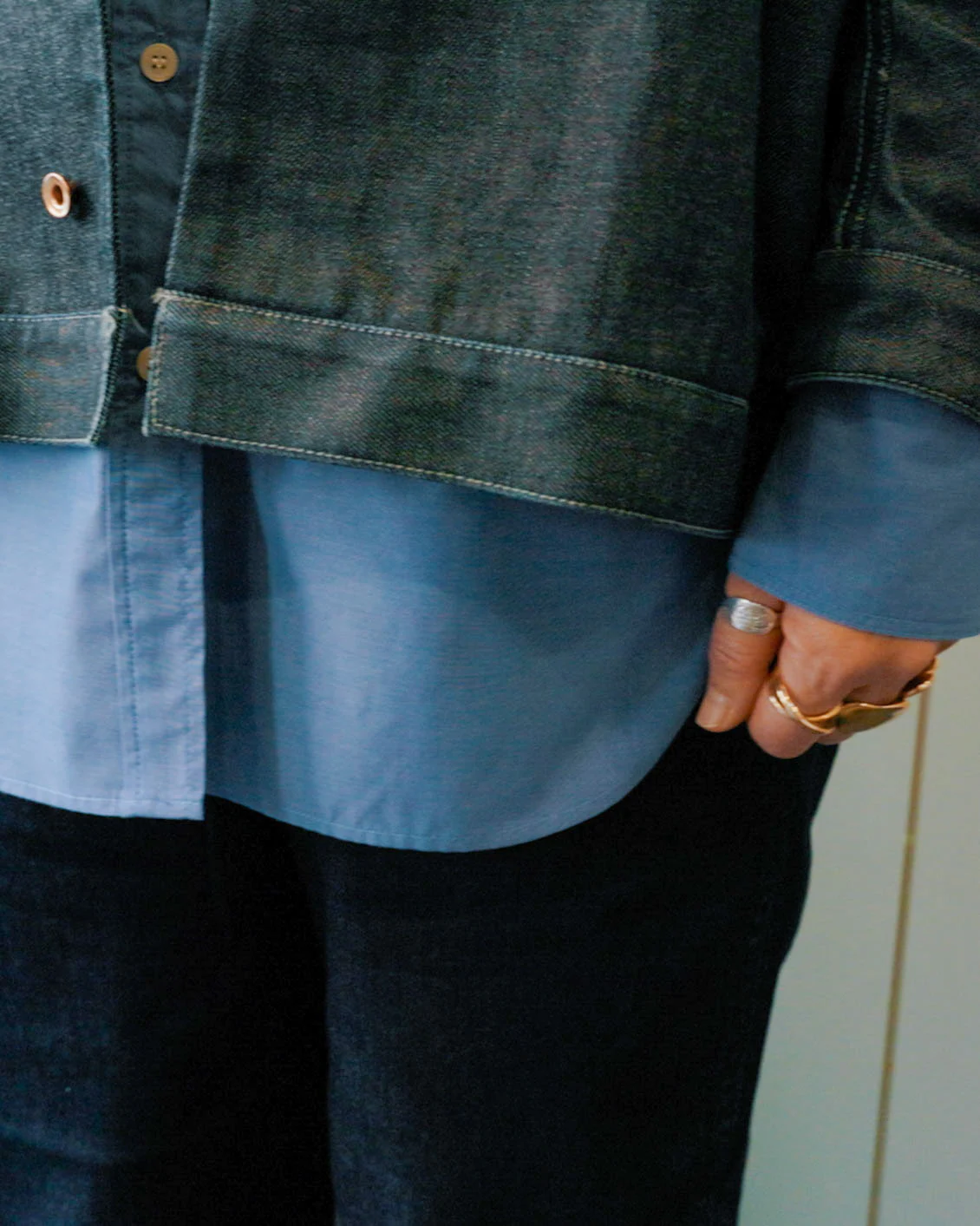 爽やかな印象のブルーは、上下にデニムを合わせてワントーンコーディネートに。