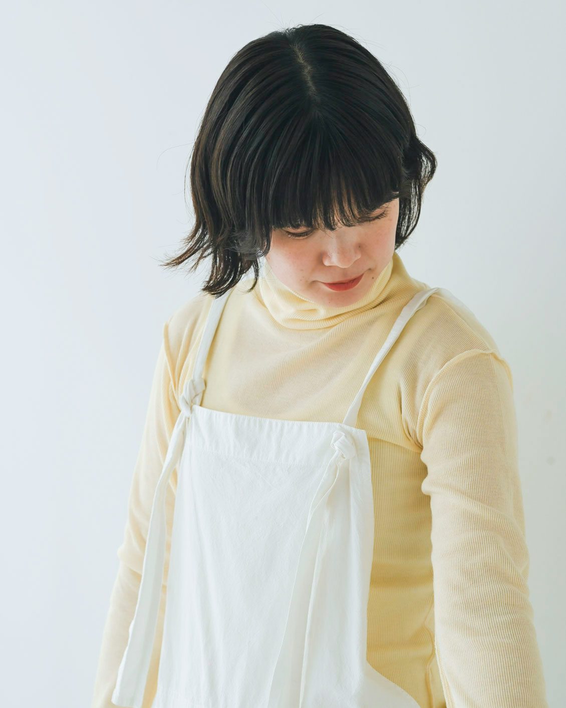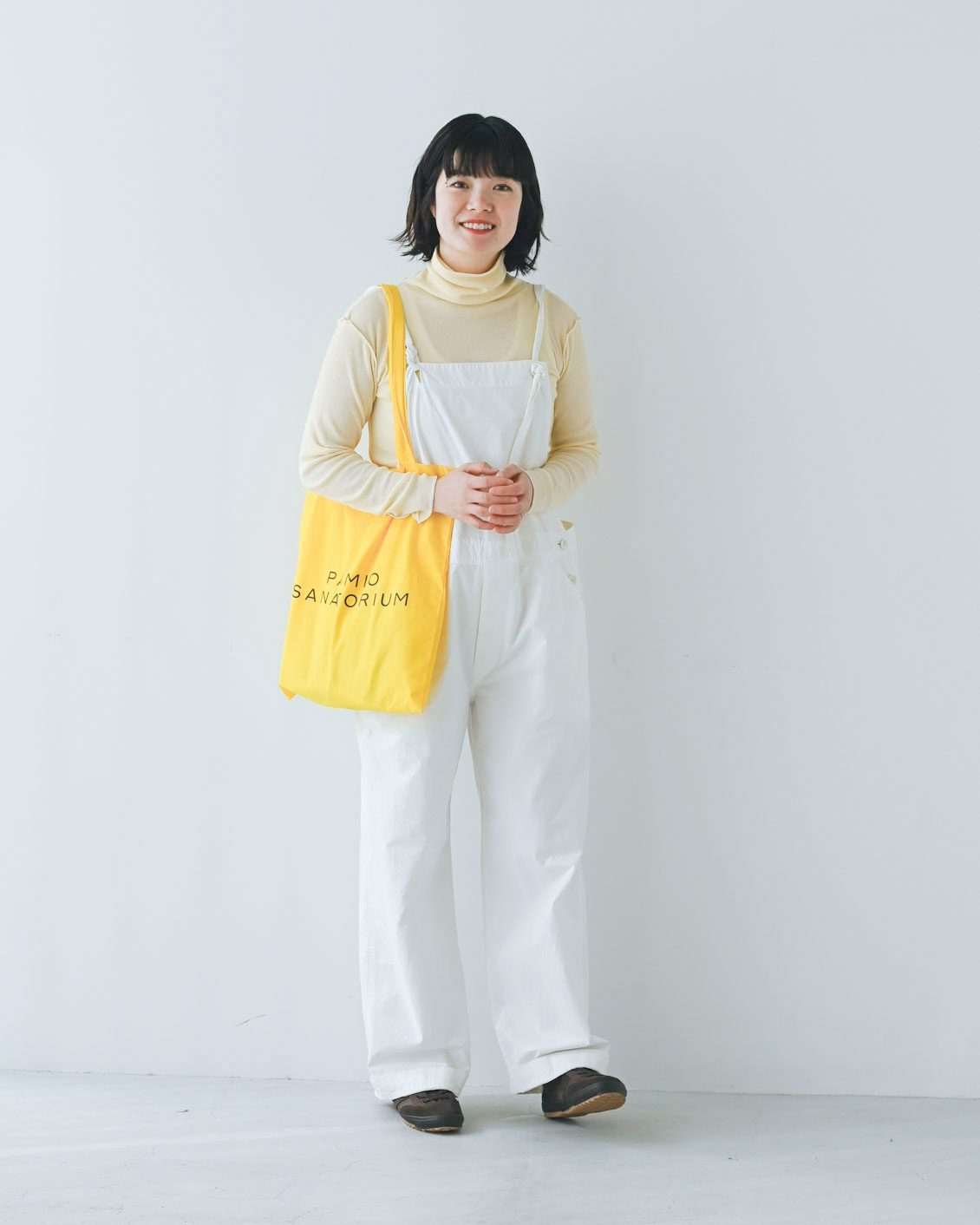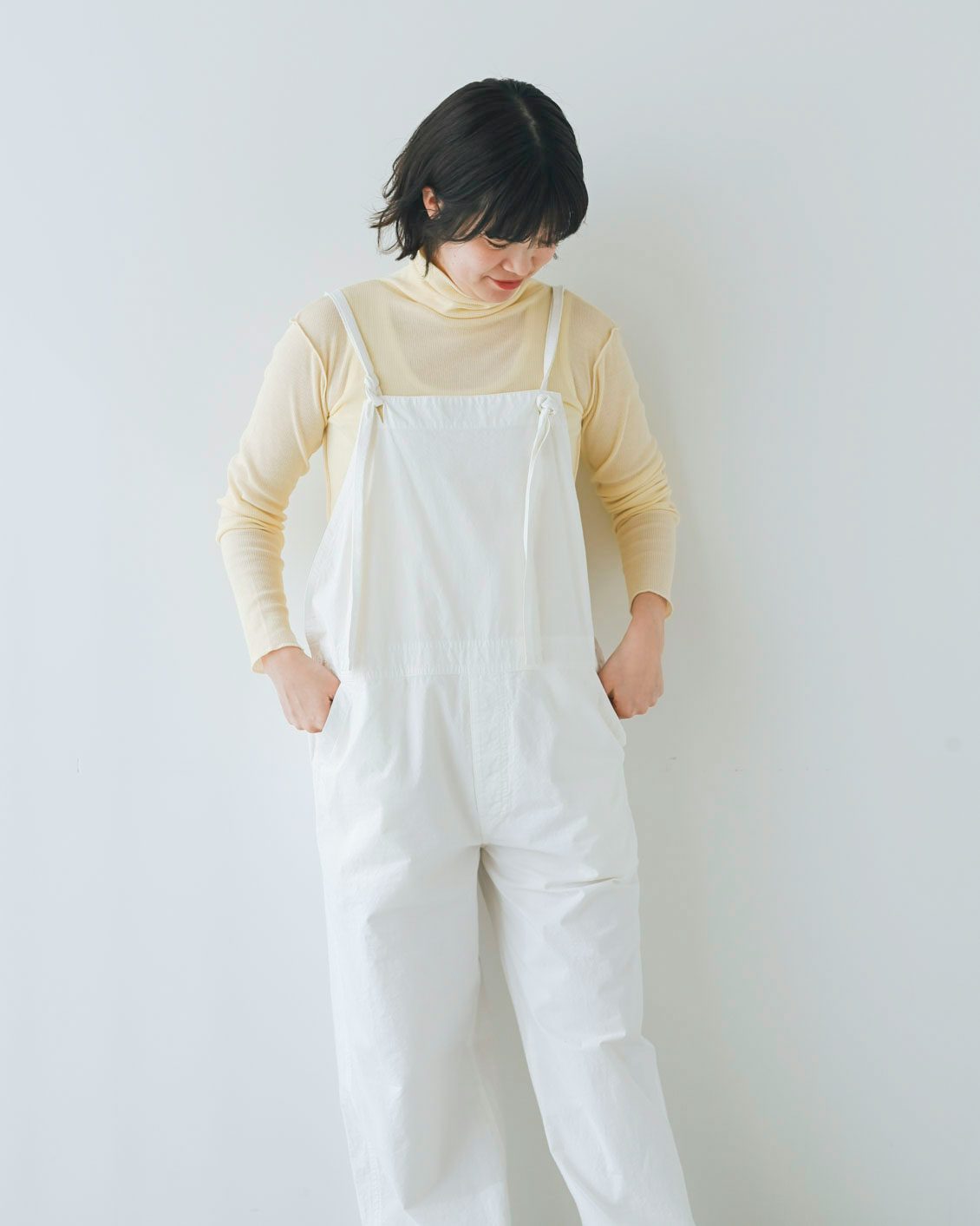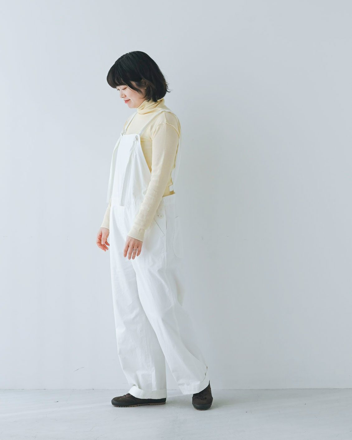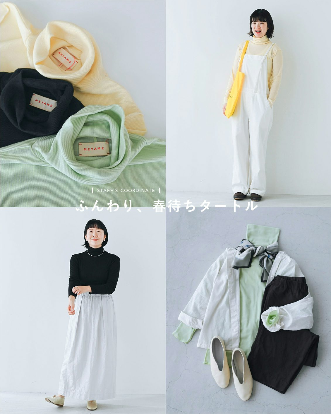「いろいろなタートルネックがありますが、MEYAMEはカラーリングが一番の魅力だと思います。このクリームは、黄色すぎず、でも春らしい華やかさもある絶妙な色味。今回はカラーが引き立つように、春先に着たいと思っていたシンプルな白サロペットに合わせてみました」