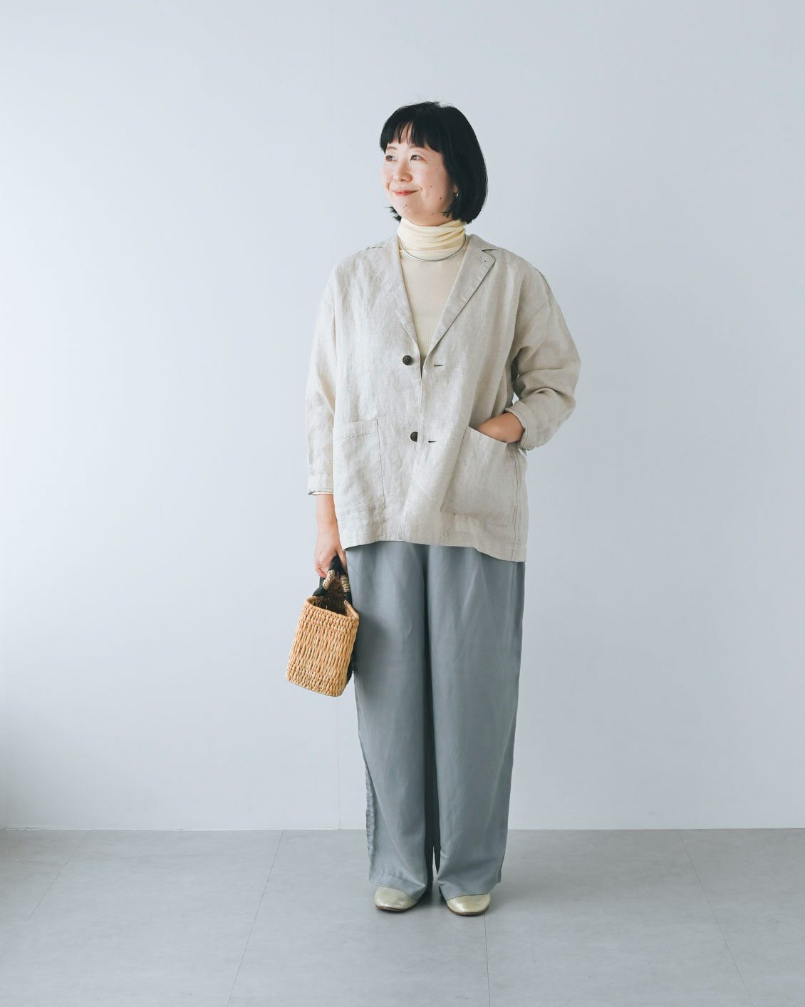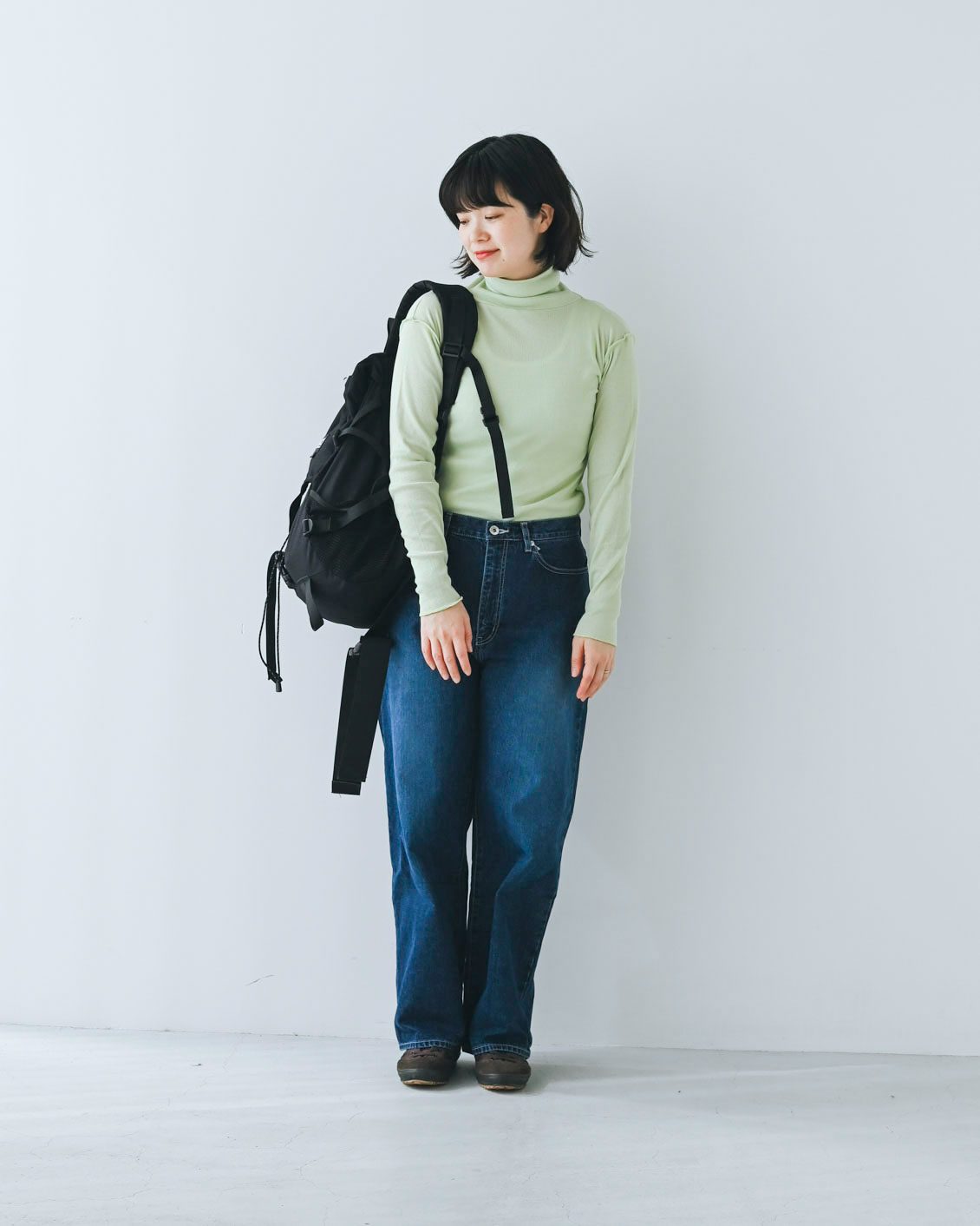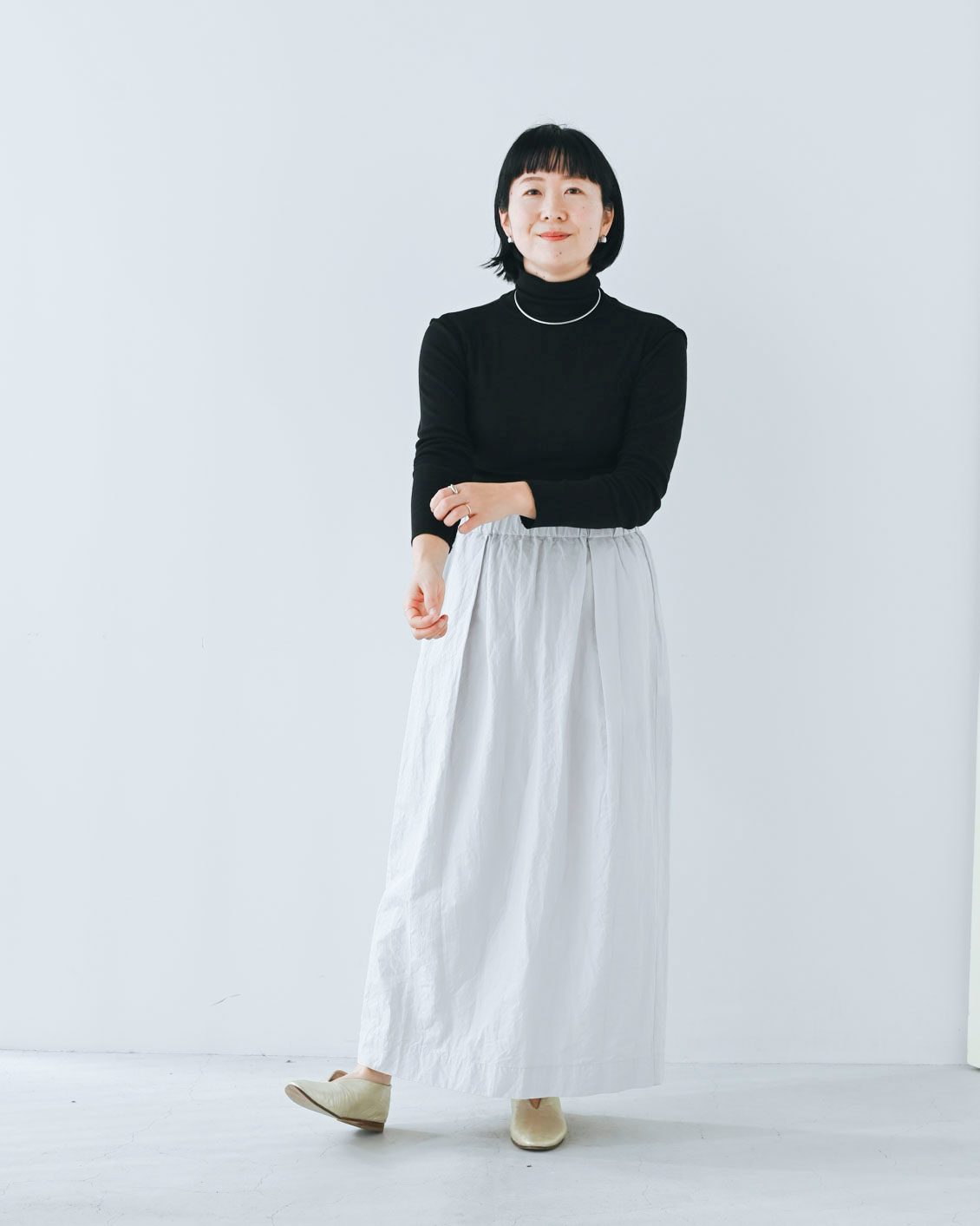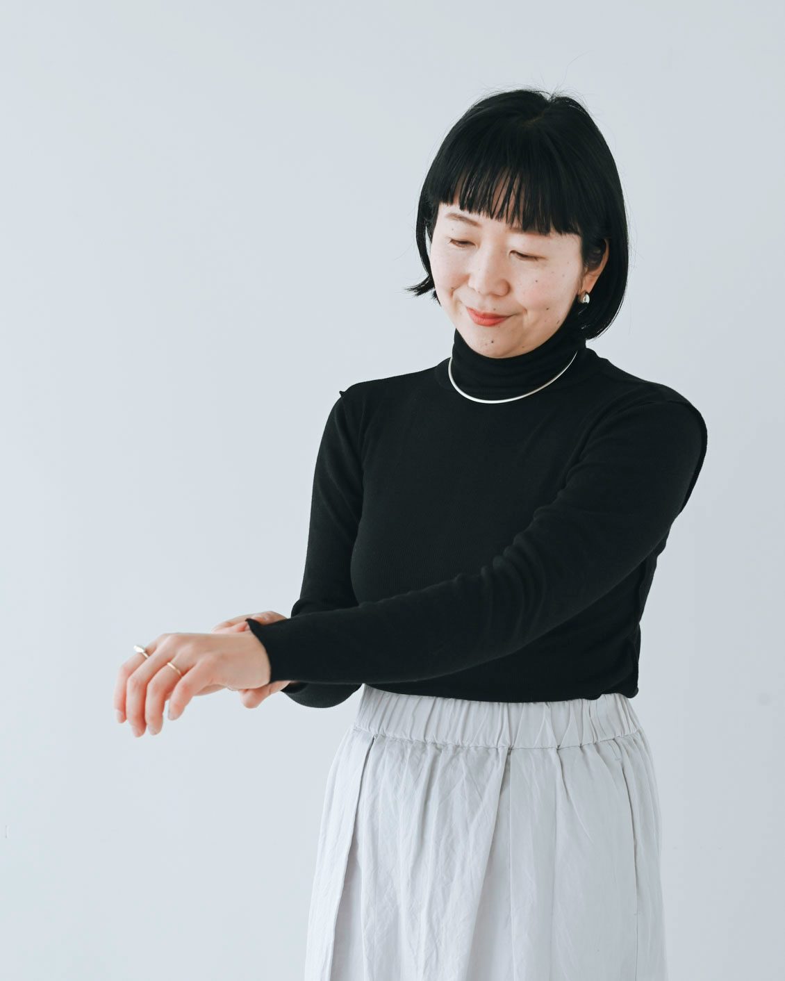 「個人的には、首がしめつけられる感じが得意ではなくて、タートルネックを持っていませんでしたが、このアイテムは生地がとても柔らかいのでストレスフリーに着られています。腕周りもゆとりがあって着ていて楽ちんですね。