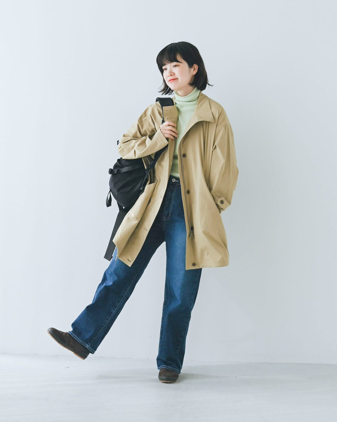 お次はトレンチコートから、ちらりとミントグリーンをのぞかせて。