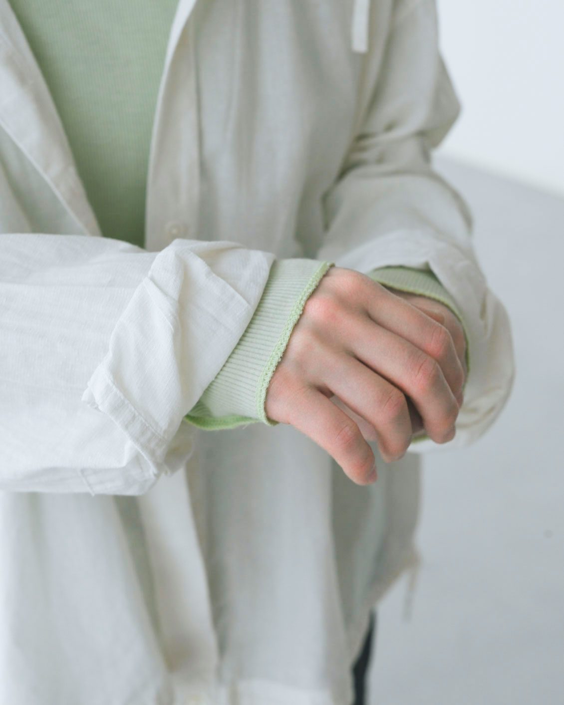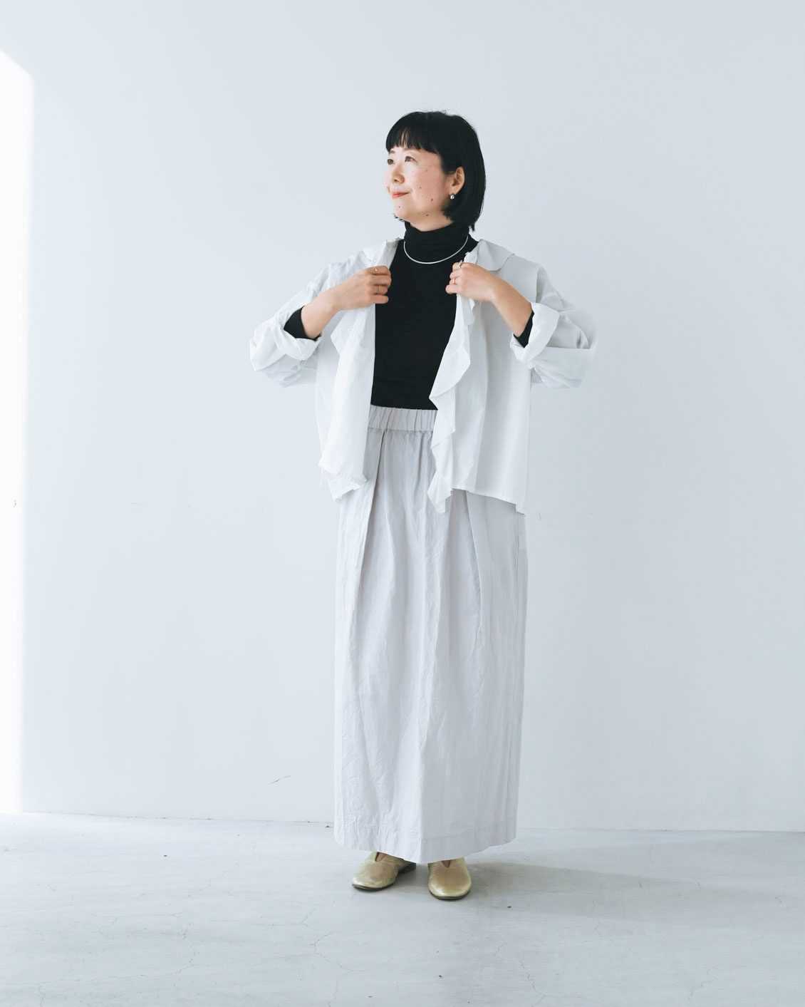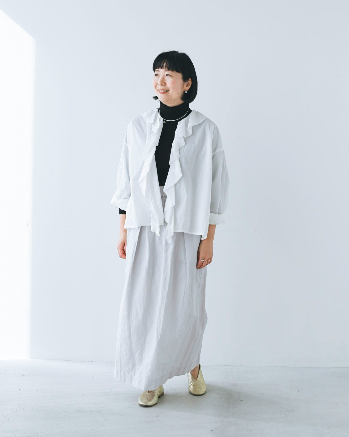 またわたしは汗っかきなので、生地が厚すぎると、暑くなってしまうのが苦手で。でもこれはぶ厚すぎない。0.5枚みたいな感覚でさらっと着られて嬉しいです」